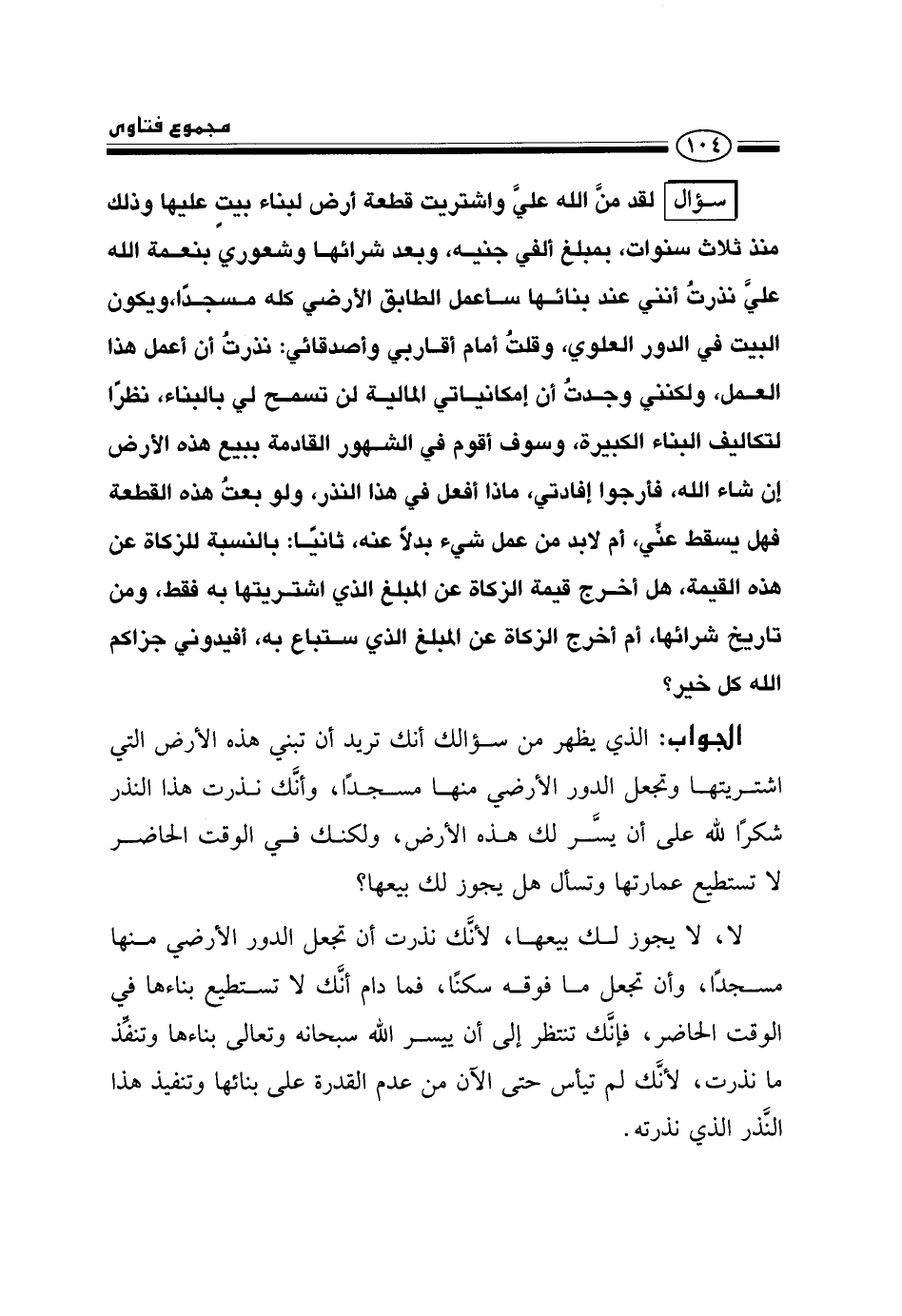 سؤال: لقد من الله علي واشتريت قطعة أرض لبناء بيت عليها وذلك منذ ثلاث سنوات، بمبلغ ألفي جنيه، وبعد شرائها وشعوري بنعمة الله علي نذرت أنني عند بنائها سأعمل الطابق الأرضي كله مسجدًا، ويكون البيت في الدور العلوي، وقلت أمام أقاربي وأصدقائي: نذرت أن أعمل هذا العمل، ولكنني وجدت أن إمكانياتي المالية لن تسمح لي بالبناء، نظرًا لتكاليف البناء الكبيرة، وسوف أقوم في الشهور القادمة ببيع هذه الأرض إن شاء الله، فأرجو إفادتي، ماذا أفعل في هذا النذر، ولو بعت هذه القطعة فهل يسقط عني، أم لا بد من عمل شيء بدلًا عنه، ثانيًا: بالنسبة للزكاة عن هذه القيمة، هل أخرج قيمة الزكاة عن المبلغ الذي اشتريتها به فقط، ومن تاريخ شرائها، أم أخرج الزكاة عن المبلغ الذي ستباع به، أفيدوني جزاكم الله كل خير؟