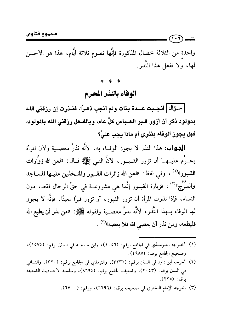 الجواب: هذا النذر لا يجوز الوفاء به؛ لأنه نذر معصية، ولأن المرأة يحرم عليها أن تزور القبور؛ لأن النبي صلى الله عليه وسلم قال: «لعن الله زوارات القبور» ، وفي لفظ: «لعن الله زائرات القبور والمتخذين عليها المساجد والسرج» ، فزيارة القبور إنما هي مشروعة في حق الرجال فقط، دون النساء، فإذا نذرت المرأة أن تزور القبور، أو تزور قبرًا معينًا، فإنه لا يجوز لها الوفاء بهذا النذر؛ لأنه نذر معصية، ولقوله صلى الله عليه وسلم: «من نذر أن يطيع الله فليطعه، ومن نذر أن يعصي الله فلا يعصه» .