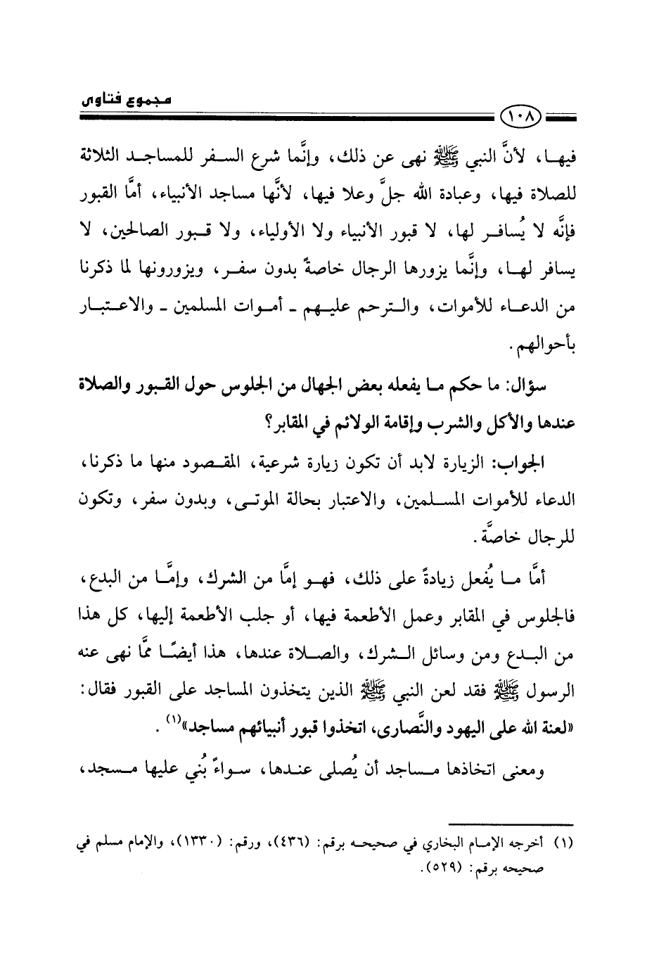 أما ما يفعل زيادة على ذلك، فهو إما من الشرك، وإما من البدع، فالجلوس في المقابر وعمل الأطعمة فيها، أو جلب الأطعمة إليها، كل هذا من البدع ومن وسائل الشرك، والصلاة عندها، هذا أيضًا مما نهى عنه الرسول صلى الله عليه وسلم، فقد لعن النبي صلى الله عليه وسلم الذين يتخذون المساجد على القبور، فقال: «لعنة الله على اليهود والنصارى، اتخذوا قبور أنبيائهم مساجد» .