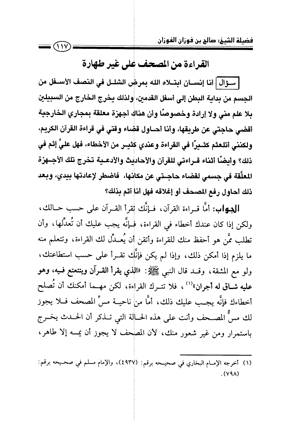 سؤال: أنا إنسان ابتلاه الله بمرض الشلل في النصف الأسفل من الجسم من بداية البطن إلى أسفل القدمين، ولذلك يخرج الخارج من السبيلين بلا علم مني ولا إرادة، وخصوصًا وأن هناك أجهزة معلقة بمجاريَّ الخارجية أقضي حاجتي عن طريقها، وأنا أحاول قضاء وقتي في قراءة القرآن الكريم، ولكنني أتلعثم كثيرًا في القراءة وعندي كثير من الأخطاء، فهل علي إثم في ذلك؟ وأيضًا أثناء قراءتي للقرآن والأحاديث والأدعية تخرج تلك الأجهزة المعلقة في جسمي لقضاء حاجتي عن مكانها، فاضطر لإعادتها بيدي، وبعد ذلك أحاول رفع المصحف أو إغلاقه، فهل أنا آثم بذلك؟