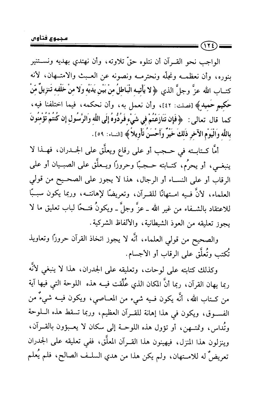 أما كتابته في حجب أو على رقاع ويعلق على الجدران، فهذا لا ينبغي، أو يحرم كتابته حجبًا وحروزًا ويعلق على الصبيان أو على الرقاب أو على النساء أو الرجال، هذا لا يجوز على الصحيح من قولي العلماء؛ لأن فيه امتهانًا للقرآن، وتعريضًا لإهانته، وربما يكون سببًا للاعتقاد بالشفاء من غير الله - عز وجل - ويكون فتحًا لباب تعليق ما لا يجوز تعليقه من العوذ الشيطانية، والألفاظ الشركية.