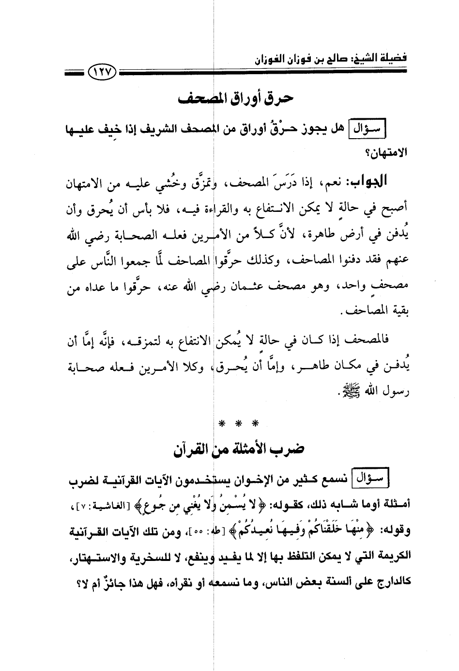 سؤال: هل يجوز حرق أوراق من المصحف الشريف إذا خيف عليها الامتهان؟