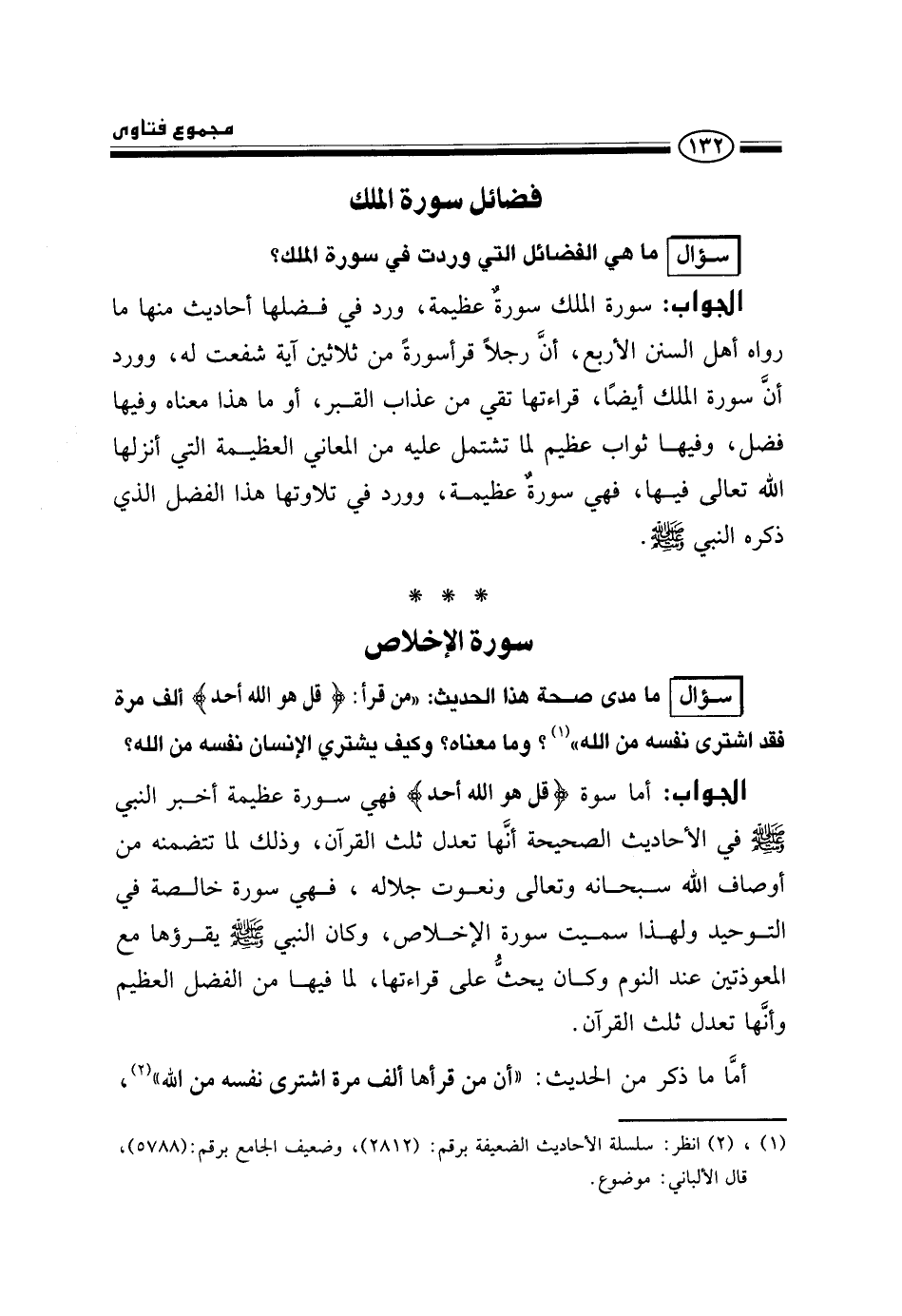 سؤال: ما مدى صحة هذا الحديث: «من قرأ: {قُلْ هُوَ اللَّهُ أَحَدٌ} ألف مرة فقد اشترى نفسه من الله» ؟ وما معناه؟ وكيف يشتري الإنسان نفسه من الله؟