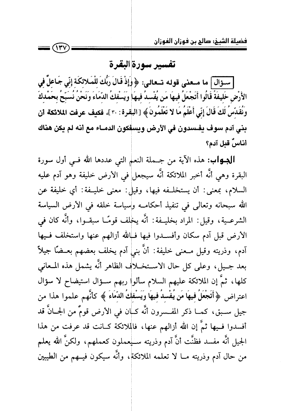 الجواب: هذه الآية من جملة النعم التي عددها الله في أول سورة البقرة، وهي أنه أخبر الملائكة أنه سيجعل في الأرض خليفة وهو آدم عليه السلام، بمعنى: أن يستخلفه فيها، وقيل: معنى خليفة أي خليفة عن الله سبحانه وتعالى في تنفيذ أحكامه وسياسة خلقه في الأرض السياسة الشرعية، وقيل: المراد بخليفة أنه يخلف قومًا سبقوا، وأنه كان في الأرض قبل آدم سكان وأفسدوا فيها، فالله أزالهم عنها واستخلف فيها آدم وذريته، وقيل: معنى خليفة أن بني آدم يخلف بعضهم بعضًا جيلًا بعد جيل، وعلى كل حال الاستخلاف الظاهر أنه يشمل هذه المعاني كلها، ثم إن الملائكة عليهم السلام سألوا ربهم سؤال استيضاح لا سؤال اعتراض {أَتَجْعَلُ فِيهَا مَنْ يُفْسِدُ فِيهَا وَيَسْفِكُ الدِّمَاءَ} كأنهم علموا هذا من جيل سبق، كما ذكر المفسرون أنه كان في الأرض قوم من الجان قد أفسدوا فيها، ثم إن الله أزالهم عنها، فالملائكة كانت قد عرفت من هذا الجيل أنه مفسد، فظنت أن آدم وذريته سيعملون كعملهم، ولكن الله يعلم من حال آدم وذريته ما لا تعلمه الملائكة، وأنه سيكون فيهم من الطيبين
