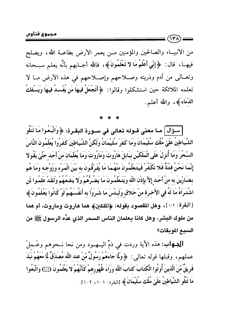 سؤال: ما معنى قوله تعالى في سورة البقرة: {وَاتَّبَعُوا مَا تَتْلُو الشَّيَاطِينُ عَلَى مُلْكِ سُلَيْمَانَ وَمَا كَفَرَ سُلَيْمَانُ وَلَكِنَّ الشَّيَاطِينَ كَفَرُوا يُعَلِّمُونَ النَّاسَ السِّحْرَ وَمَا أُنْزِلَ عَلَى الْمَلَكَيْنِ بِبَابِلَ هَارُوتَ وَمَارُوتَ وَمَا يُعَلِّمَانِ مِنْ أَحَدٍ حَتَّى يَقُولَا إِنَّمَا نَحْنُ فِتْنَةٌ فَلَا تَكْفُرْ فَيَتَعَلَّمُونَ مِنْهُمَا مَا يُفَرِّقُونَ بِهِ بَيْنَ الْمَرْءِ وَزَوْجِهِ وَمَا هُمْ بِضَارِّينَ بِهِ مِنْ أَحَدٍ إِلَّا بِإِذْنِ اللَّهِ وَيَتَعَلَّمُونَ مَا يَضُرُّهُمْ وَلَا يَنْفَعُهُمْ وَلَقَدْ عَلِمُوا لَمَنِ اشْتَرَاهُ مَا لَهُ فِي الْآخِرَةِ مِنْ خَلَاقٍ وَلَبِئْسَ مَا شَرَوْا بِهِ أَنْفُسَهُمْ لَوْ كَانُوا يَعْلَمُونَ وَلَوْ أَنَّهُمْ آمَنُوا وَاتَّقَوْا لَمَثُوبَةٌ مِنْ عِنْدِ اللَّهِ خَيْرٌ لَوْ كَانُوا يَعْلَمُونَ} [البقرة: 102] ، وهل المقصود بقوله: {الْمَلَكَيْنِ} هما هاروت وماروت، أم هما من ملوك البشر، وهل كانا يعلمان الناس السحر الذي عده الرسول صلى الله عليه وسلم من السبع الموبقات؟