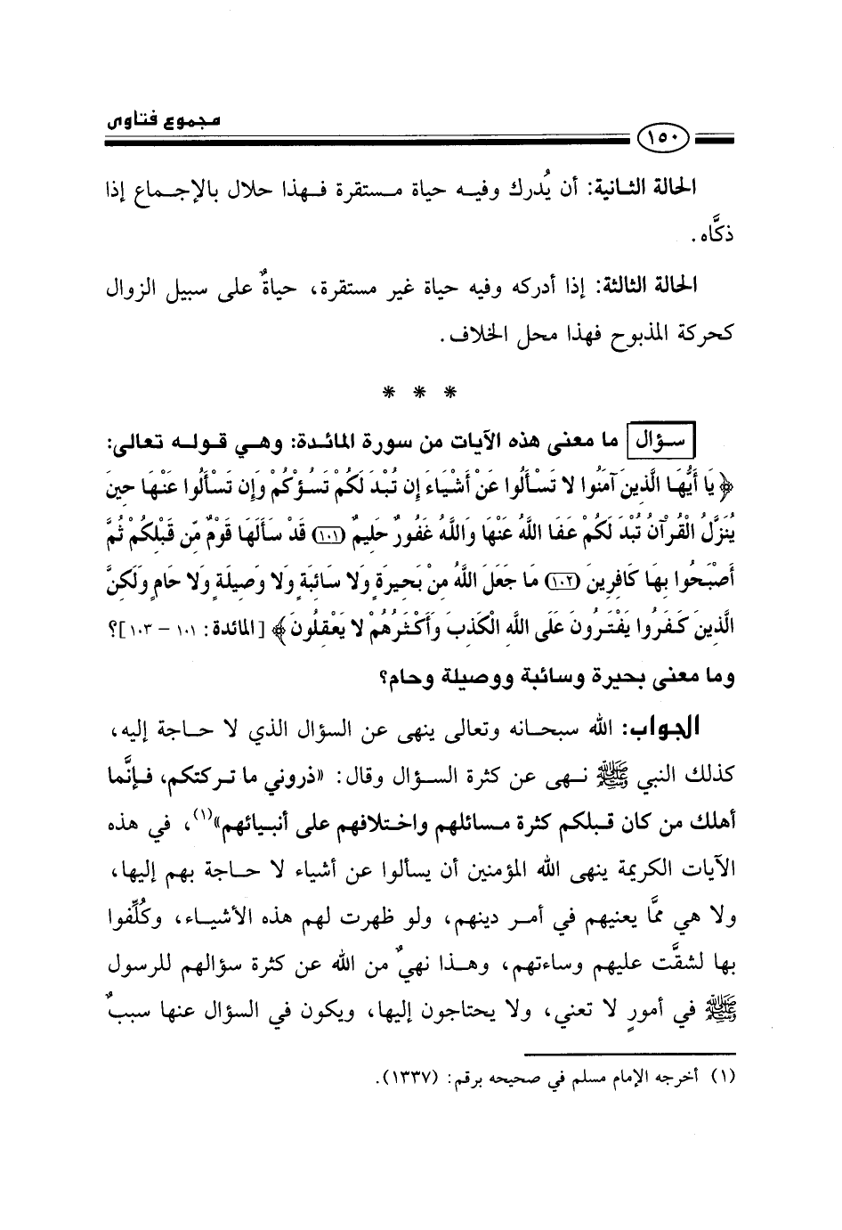 سؤال: ما معنى هذه الآيات من سورة المائدة: وهي قوله تعالى: {يَاأَيُّهَا الَّذِينَ آمَنُوا لَا تَسْأَلُوا عَنْ أَشْيَاءَ إِنْ تُبْدَ لَكُمْ تَسُؤْكُمْ وَإِنْ تَسْأَلُوا عَنْهَا حِينَ يُنَزَّلُ الْقُرْآنُ تُبْدَ لَكُمْ عَفَا اللَّهُ عَنْهَا وَاللَّهُ غَفُورٌ حَلِيمٌ قَدْ سَأَلَهَا قَوْمٌ مِنْ قَبْلِكُمْ ثُمَّ أَصْبَحُوا بِهَا كَافِرِينَ مَا جَعَلَ اللَّهُ مِنْ بَحِيرَةٍ وَلَا سَائِبَةٍ وَلَا وَصِيلَةٍ وَلَا حَامٍ وَلَكِنَّ الَّذِينَ كَفَرُوا يَفْتَرُونَ عَلَى اللَّهِ الْكَذِبَ وَأَكْثَرُهُمْ لَا يَعْقِلُونَ} [المائدة: 101، 103] ؟ وما معنى بحيرة وسائبة ووصيلة وحام؟