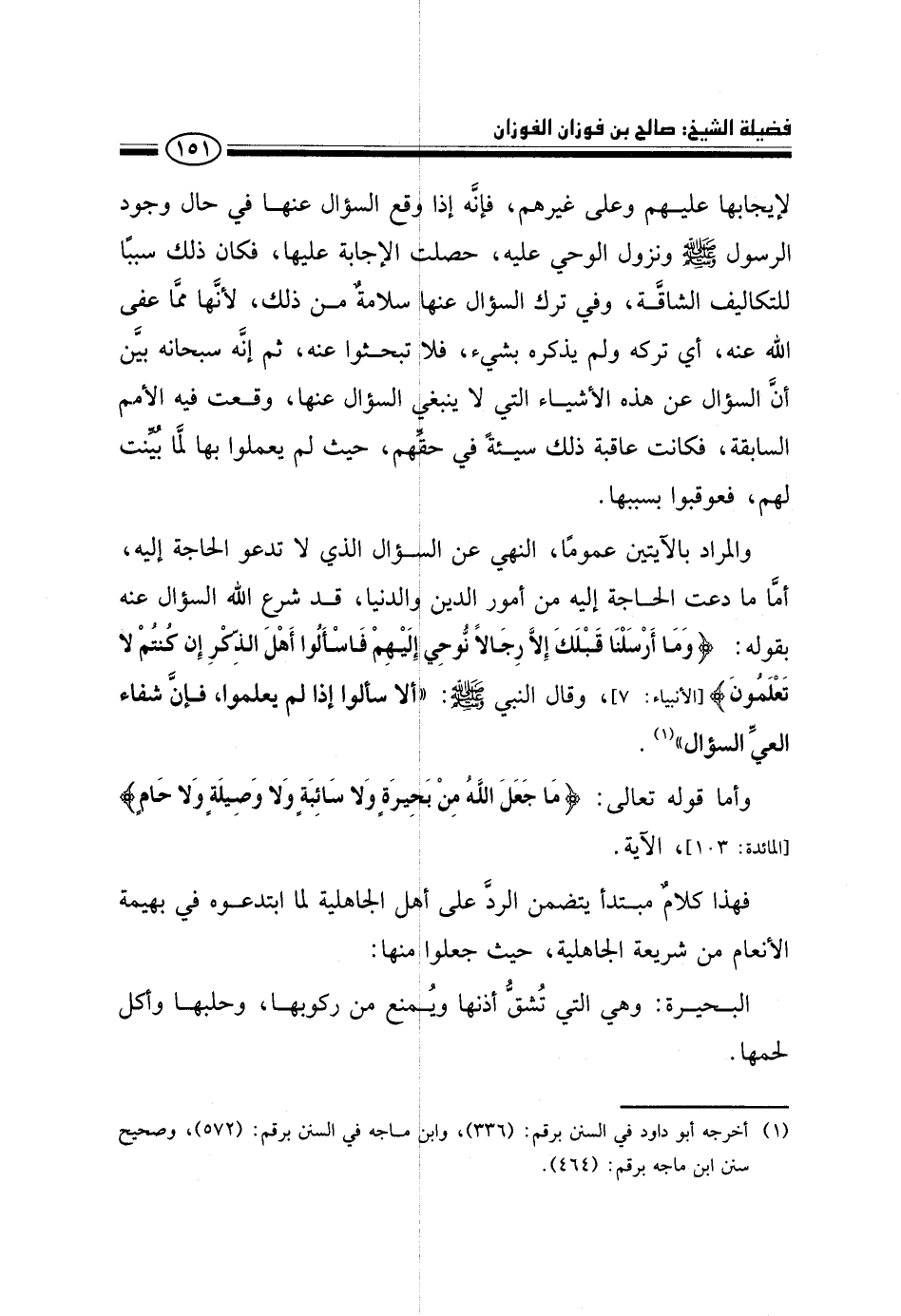 والمراد بالآيتين عمومًا النهي عن السؤال الذي لا تدعو الحاجة إليه، أما ما دعت الحاجة إليه من أمور الدين والدنيا، قد شرع الله السؤال عنه بقوله: {وَمَا أَرْسَلْنَا قَبْلَكَ إِلَّا رِجَالًا نُوحِي إِلَيْهِمْ فَاسْأَلُوا أَهْلَ الذِّكْرِ إِنْ كُنْتُمْ لَا تَعْلَمُونَ} [الأنبياء: 7] ، وقال النبي صلى الله عليه وسلم: «ألا سألوا إذا لم يعلموا، فإن شفاء العي السؤال» .