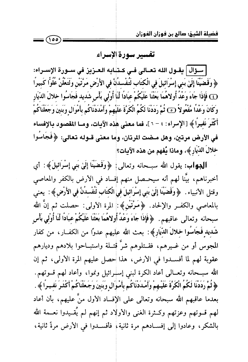 الجواب: يقول الله سبحانه وتعالى: {وَقَضَيْنَا إِلَى بَنِي إسْرائِيلَ} : أي أخبرناهم، بينا لهم أنه سيحصل منهم إفساد في الأرض بالكفر والمعاصي وقتل الأنبياء. {وَقَضَيْنَا إِلَى بَنِي إسْرائِيلَ فِي الْكِتَابِ لَتُفْسِدُنَّ فِي الْأَرْضِ} : يعني بالمعاصي والكفر والإلحاد. {مَرَّتَيْنِ} ، المرة الأولى حصلت، ثم إن الله سبحانه وتعالى عاقبهم. {فَإِذَا جَاءَ وَعْدُ أُولَاهُمَا بَعَثْنَا عَلَيْكُمْ عِبَادًا لَنَا أُولِي بَأْسٍ شَدِيدٍ فَجَاسُوا خِلَالَ الدِّيَارِ} : بعث الله عليهم عدوًا من الكفار، من كفار المجوس أو من غيرهم، فقتلوهم شر قتلة واستباحوا بلادهم وديارهم عقوبة لهم لما أفسدوا في الأرض، هذا حصل عليهم المرة الأولى، ثم إن الله سبحانه وتعالى أعاد الكرة لبني إسرائيل ونموا، وأعاد لهم قوتهم.