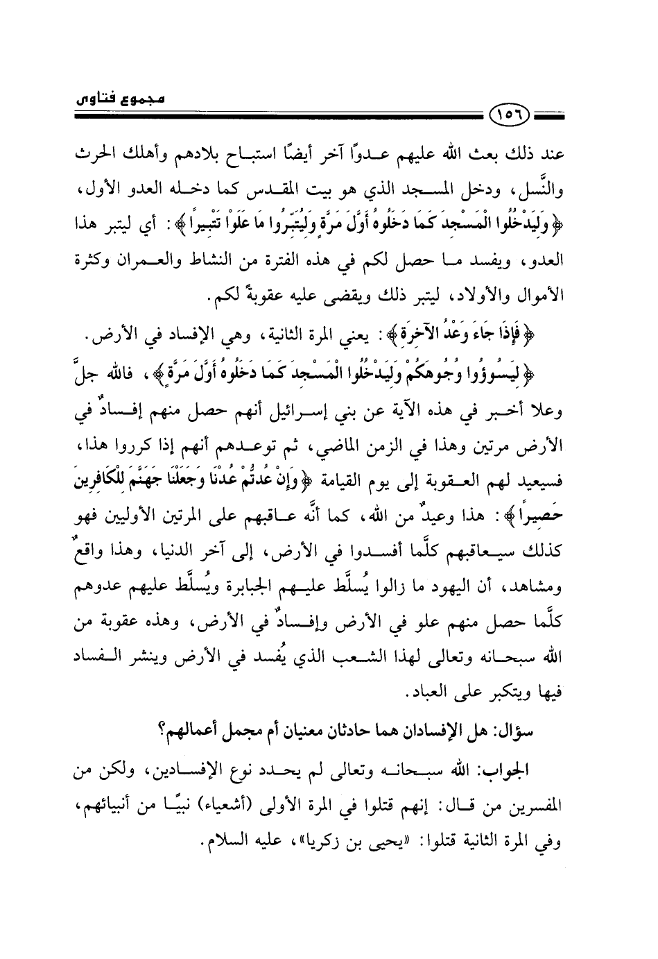 سؤال: هل الإفسادان هما حادثان معنيان أم مجمل أعمالهم؟