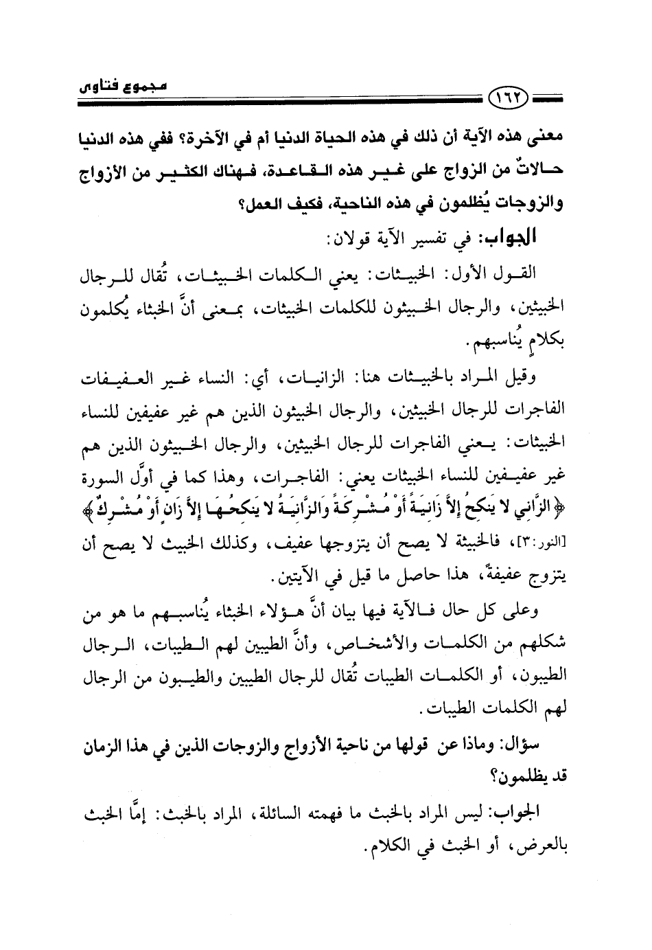 وقيل: المراد بالخبيثات هنا الزانيات، أي: النساء غير العفيفات الفاجرات للرجال الخبيثين، والرجال الخبيثون الذين هم غير عفيفين للنساء الخبيثات، يعني الفاجرات للرجال الخبيثين، والرجال الخبيثون الذين هم غير عفيفين للنساء الخبيثات، يعني الفاجرات، وهذا كما في أول السورة {الزَّانِي لَا يَنْكِحُ إلَّا زَانِيَةً أَوْ مُشْرِكَةً وَالزَّانِيَةُ لَا يَنْكِحُهَا إِلَّا زَانٍ أَوْ مُشْرِكٌ} [النور: 3] ، فالخبيثة لا يصح أن يتزوجها عفيف، وكذلك الخبيث لا يصح أن يتزوج عفيفة، هذا حاصل ما قيل في الآيتين.
