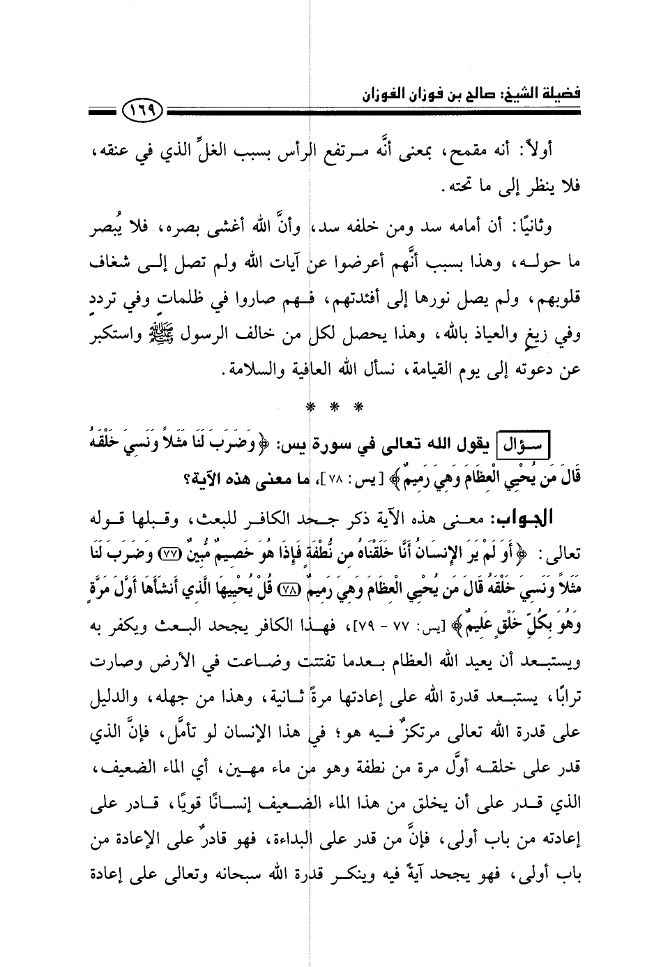 سؤال: يقول الله تعالى في سورة يس: {وَضَرَبَ لَنَا مَثَلًا وَنَسِيَ خَلْقَهُ قَالَ مَنْ يُحْيِي الْعِظَامَ وَهِيَ رَمِيمٌ} [يس: 78] ، ما معنى هذه الآية؟