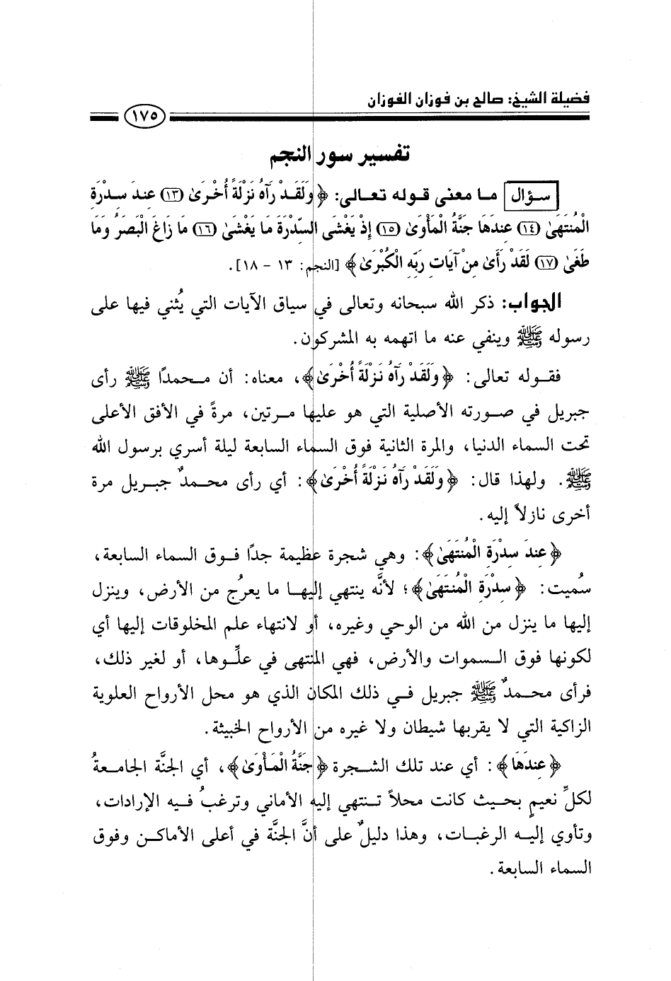 سؤال: ما معنى قوله تعالى: {وَلَقَدْ رَآهُ نَزْلَةً أُخْرَى} {عِنْدَ سِدْرَةِ الْمُنْتَهَى عِنْدَهَا جَنَّةُ الْمَأْوَى إِذْ يَغْشَى السِّدْرَةَ مَا يَغْشَى مَا زَاغَ الْبَصَرُ وَمَا طَغَى لَقَدْ رَأَى مِنْ آيَاتِ رَبِّهِ الْكُبْرَى} [النجم: 13-18] .