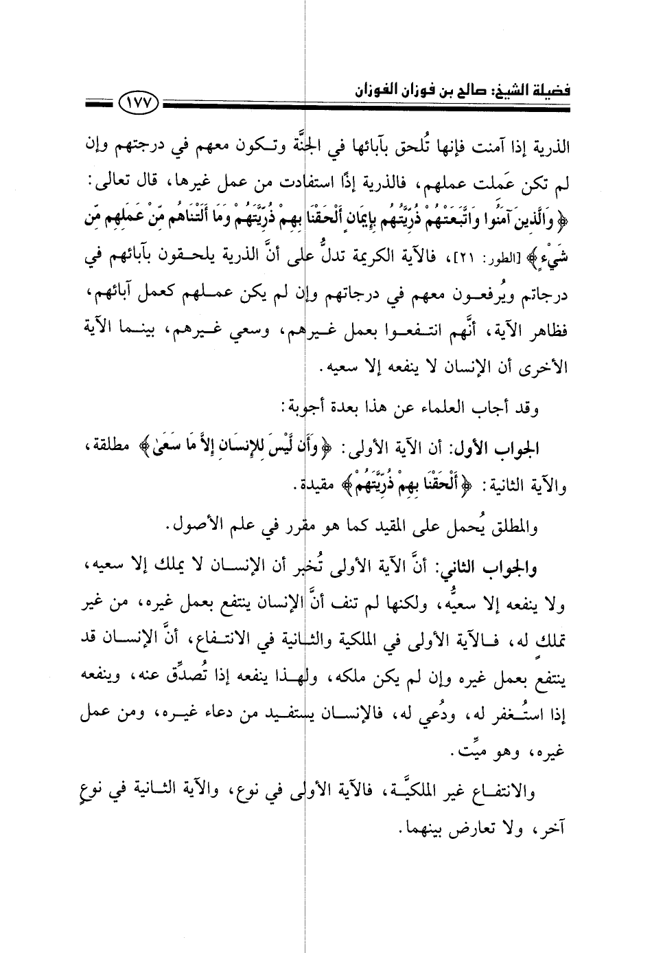 الذرية إذا آمنت فإنها تلحق بآبائها في الجنة وتكون معهم في درجتهم وإن لم تكن عملت عملهم، فالذرية إذا استفادت من عمل غيرها، قال تعالى: {وَالَّذِينَ آمَنُوا وَاتَّبَعَتْهُمْ ذُرِّيَّتُهُمْ بِإِيمَانٍ أَلْحَقْنَا بِهِمْ ذُرِّيَّتَهُمْ وَمَا أَلَتْنَاهُمْ مِنْ عَمَلِهِمْ مِنْ شَيْءٍ} [الطور: 21] ، فالآية الكريمة تدل على أن الذرية يلحقون بآبائهم في درجاتهم ويرفعون معهم في درجاتهم وإن لم يكن عملهم كعمل آبائهم، فظاهر الآية أنهم انتفعوا بعمل غيرهم وسعي غيرهم، بينما الآية الأخرى أن الإنسان لا ينفعه إلا سعيه.
