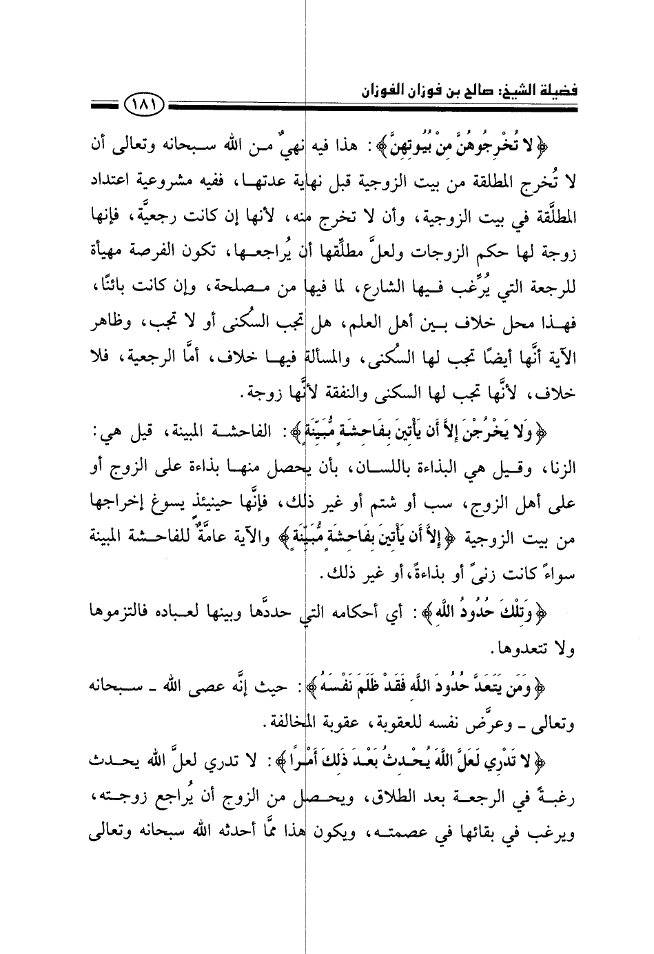 {وَلَا يَخْرُجْنَ إِلَّا أَنْ يَأْتِينَ بِفَاحِشَةٍ مُبَيِّنَةٍ} : الفاحشة المبينة، قيل: هي الزنا، وقيل: هي البذاءة باللسان، بأن يحصل منها بذاءة على الزوج أو على أهل الزوج، سب أو شتم أو غير ذلك، فإنها حينئذ يسوغ إخراجها من بيت الزوجية {إِلَّا أَنْ يَأْتِينَ بِفَاحِشَةٍ مُبَيِّنَةٍ} والآية عامة للفاحشة المبينة، سواء كانت زنا أو بذاءة أو غير ذلك.