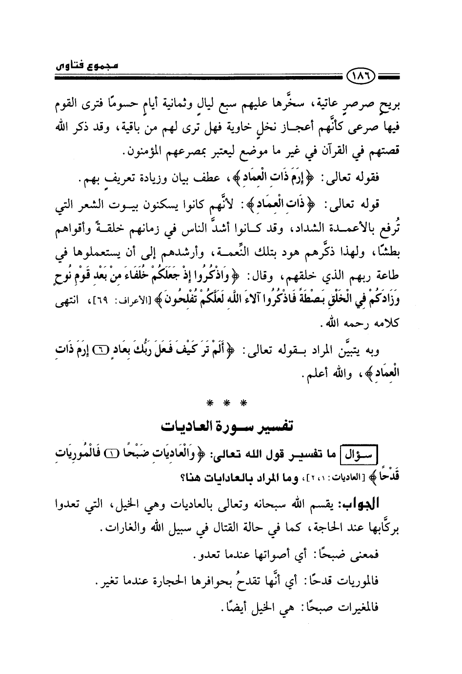 سؤال: ما تفسير قول الله تعالى: {وَالْعَادِيَاتِ ضَبْحًا فَالْمُورِيَاتِ قَدْحًا} [العاديات: 1، 2] ، وما المراد بالعاديات هنا؟
