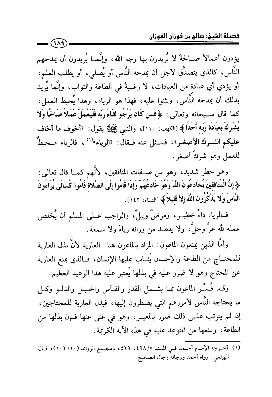 يؤدون أعمالًا صالحة لا يريدون بها وجه الله، وإنما يريدون أن يمدحهم الناس، كالذي يتصدق لأجل أن يمدحه الناس أو يصلي، أو يطلب العلم، أو يؤدي أي عبادة من العبادات، لا رغبة في الطاعة والثواب، وإنما يريد بذلك أن يمدحه الناس، ويثنوا عليه، فهذا هو الرياء، وهذا يحبط العمل، كما قال سبحانه وتعالى: {فَمَنْ كَانَ يَرْجُوا لِقَاءَ رَبِّهِ فَلْيَعْمَلْ عَمَلًا صَالِحًا وَلَا يُشْرِكْ بِعِبَادَةِ رَبِّهِ أَحَدًا} [الكهف: 110] ، والنبي صلى الله عليه وسلم يقول: «أخوف ما أخاف عليكم الشرك الأصغر، فسئل عنه، فقال: الرياء» ، فالرياء محبط للعمل وهو شرك أصغر.