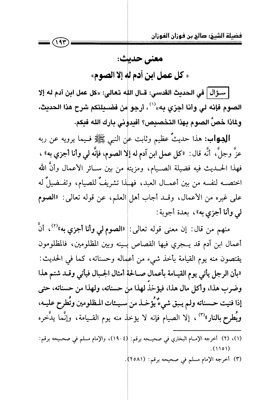 الجواب: هذا حديث عظيم وثابت عن النبي صلى الله عليه وسلم فيما يرويه عن ربه عز وجل، أنه قال: «كل عمل ابن آدم له إلا الصوم فإنه لي وأنا أجزي به» ، فهذا الحديث فيه فضيلة الصيام ومزيته من بين سائر الأعمال، وأن الله اختصه لنفسه من بين أعمال العبد، فهذا تشريف للصيام، وتفضيل له على غيره من الأعمال، وقد أجاب أهل العلم عن قوله تعالى: «الصوم لي وأنا أجزي به» بعدة أجوبة: