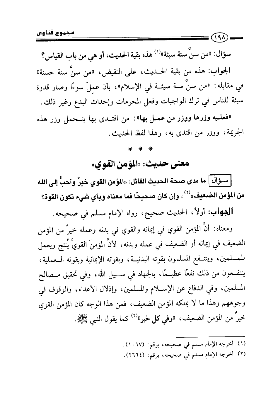 سؤال: ما مدى صحة الحديث القائل: «المؤمن القوي خير وأحب إلى الله من المؤمن الضعيف» ، وإن كان صحيحًا فما معناه وبأي شيء تكون القوة؟