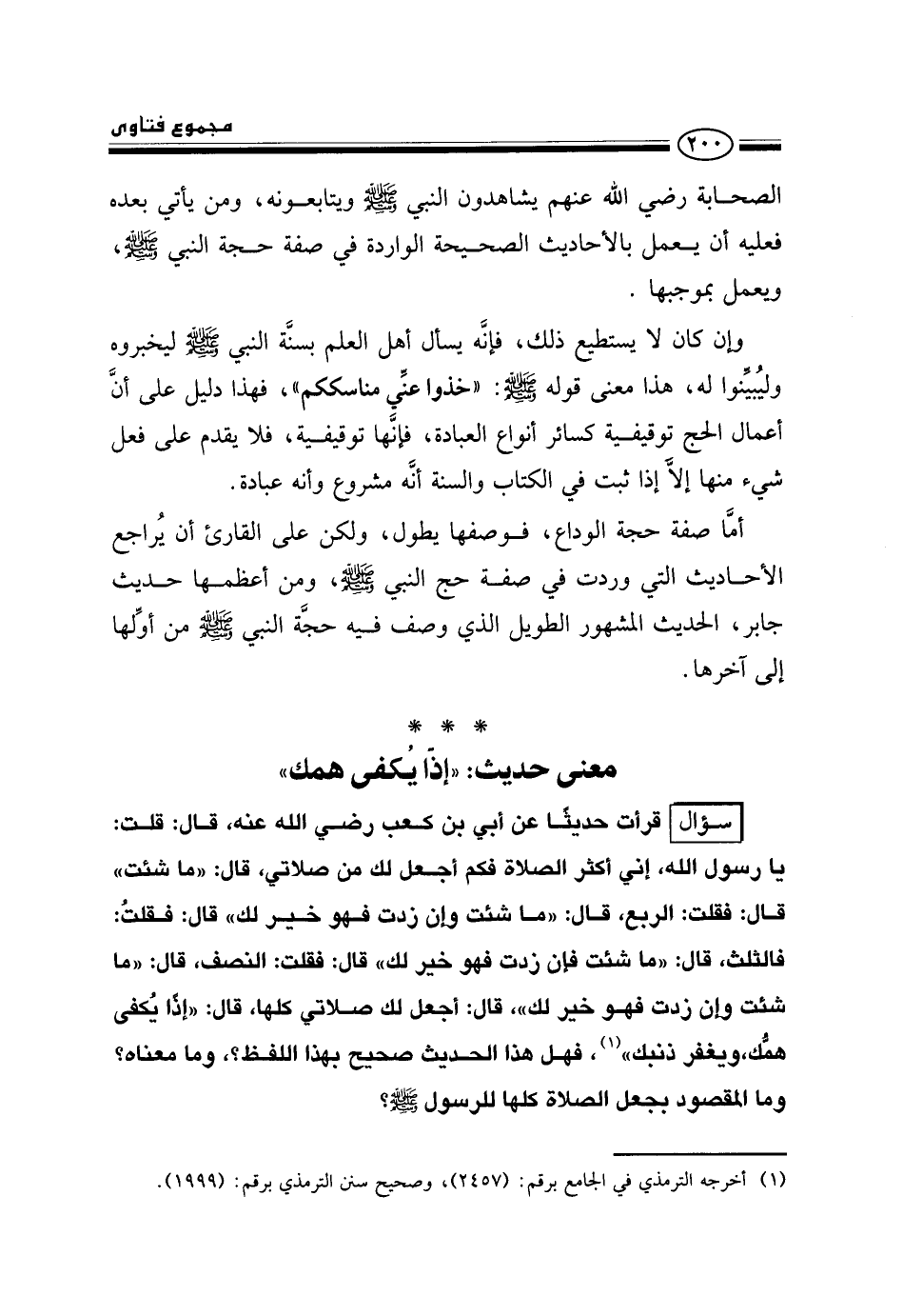 سؤال: قرأت حديثًا «عن أبي بن كعب رضي الله عنه قال: قلت: يا رسول الله، إني أكثر الصلاة، فكم أجعل لك من صلاتي؟ قال: ما شئت، قال: فقلت: الربع، قال: ما شئت، وإن زدت فهو خير لك، قال: فقلت: فالثلث، قال: ما شئت، فإن زدت فهو خير لك، قال: فقلت: النصف، قال: ما شئت، وإن زدت فهو خير لك، قال: أجعل لك صلاتي كلها؟ قال: إذا يكفى همك، ويغفر ذنبك» ، فهل هذا الحديث صحيح بهذا اللفظ؟ وما معناه؟ وما المقصود بجعل الصلاة كلها للرسول صلى الله عليه وسلم؟