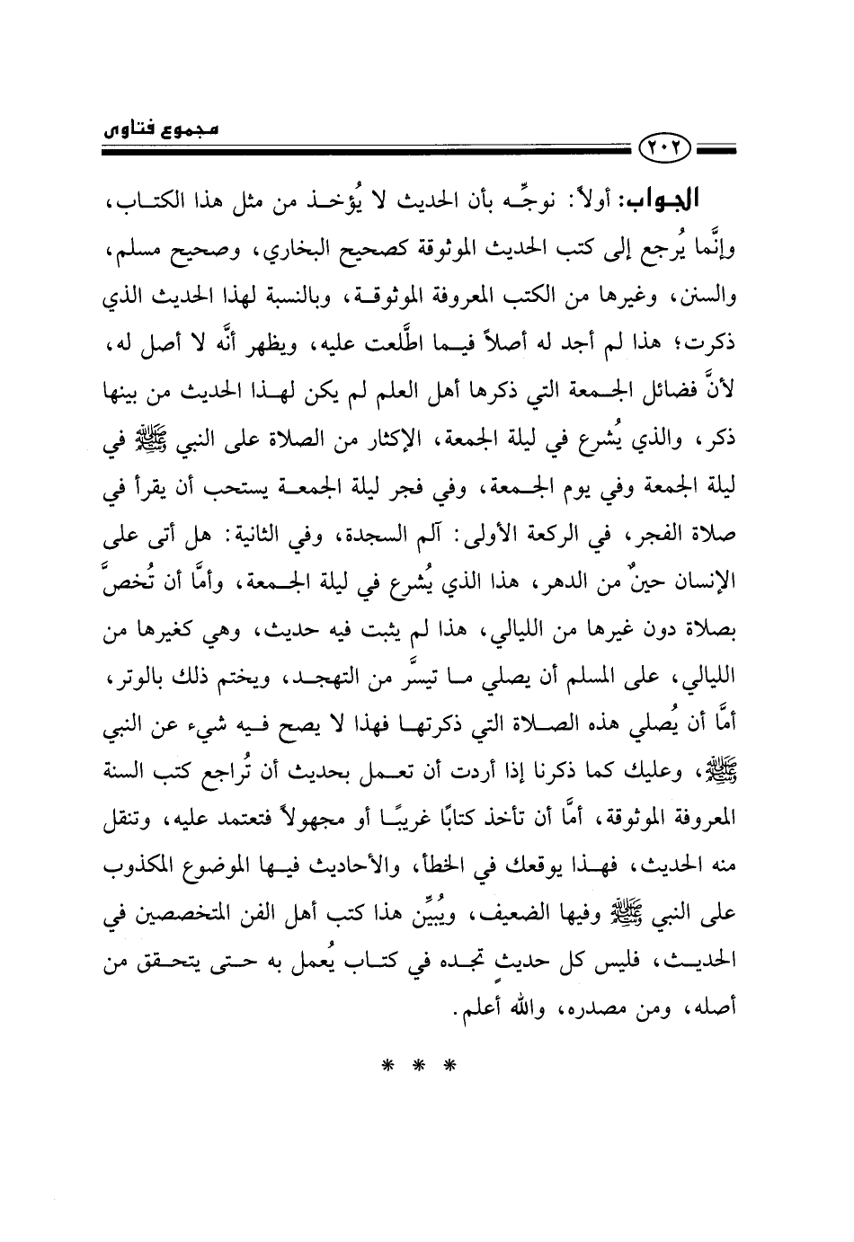 الجواب: أولًا: نوجه بأن الحديث لا يؤخذ من مثل هذا الكتاب، وإنما يرجع إلى كتب الحديث الموثوقة كصحيح البخاري، وصحيح مسلم، والسنن، وغيرها من الكتب المعروفة الموثوقة، وبالنسبة لهذا الحديث الذي ذكرت؛ هذا لم أجد له أصلًا فيما اطلعت عليه، ويظهر أنه لا أصل له؛ لأن فضائل الجمعة التي ذكرها أهل العلم لم يكن لهذا الحديث من بينها ذكر، والذي يشرع في ليلة الجمعة الإكثار من الصلاة على النبي صلى الله عليه وسلم في ليلة الجمعة وفي يوم الجمعة، وفي فجر ليلة الجمعة يستحب أن يقرأ في صلاة الفجر، في الركعة الأولى: الم السجدة، وفي الثانية: {هَلْ أَتَى عَلَى الْإِنْسَانِ حِينٌ مِنَ الدَّهْرِ} ، هذا الذي يشرع في ليلة الجمعة، وأما أن تخص بصلاة دون غيرها من الليالي، هذا لم يثبت فيه حديث، وهي كغيرها من الليالي، على المسلم أن يصلي ما تيسر من التهجد، ويختم ذلك بالوتر، أما أن يصلي هذه الصلاة التي ذكرتها فهذا لا يصح فيه شيء عن النبي صلى الله عليه وسلم، وعليك كما ذكرنا إذا أردت أن تعمل بحديث أن تراجع كتب السنة المعروفة الموثوقة، أما أن تأخذ كتابًا غريبًا أو مجهولًا فتعتمد عليه، وتنقل منه الحديث، فهذا يوقعك في الخطأ، والأحاديث فيها الموضوع المكذوب على النبي صلى الله عليه وسلم وفيها الضعيف، ويبين هذا كتب أهل الفن المتخصصين في الحديث، فليس كل حديث تجده في كتاب يعمل به حتى يتحقق من أصله، ومن مصدره، والله أعلم.