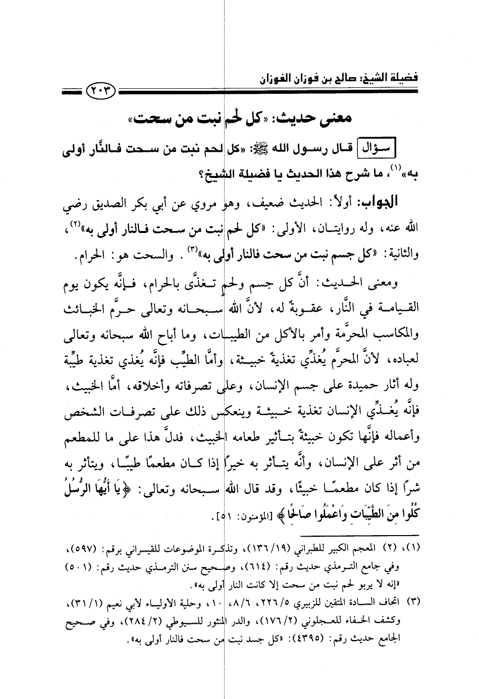 سؤال: قال رسول الله صلى الله عليه وسلم: «كل لحم نبت من سحت فالنار أولى به» ، ما شرح هذا الحديث يا فضيلة الشيخ؟