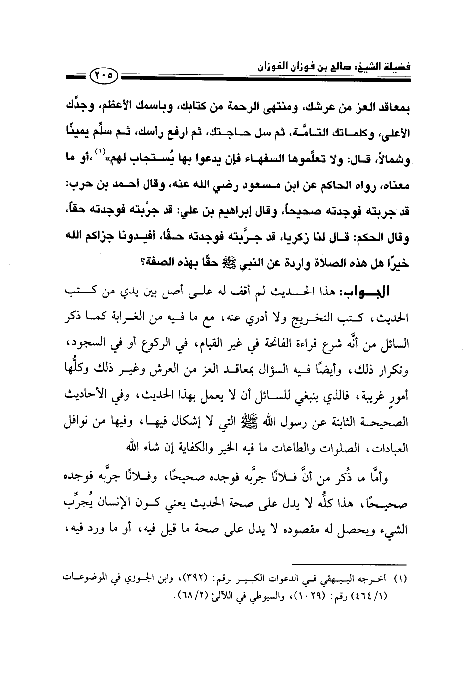 «بمعاقد العز من عرشك، ومنتهى الرحمة من كتابك، وباسمك الأعظم، وجدك الأعلى، وكلماتك التامة، ثم سل حاجتك، ثم ارفع رأسك، ثم سلم يمينًا وشمالًا، قال: ولا تعلموها السفهاء، فإن يدعوا بها يستجاب لهم» أو ما معناه، رواه الحاكم عن ابن مسعود رضي الله عنه، وقال أحمد بن حرب: قد جربته فوجدته صحيحًا، وقال إبراهيم بن علي: قد جربته فوجدته حقًّا، وقال الحاكم: قال لنا زكريا: قد جربته فوجدته حقًّا، أفيدونا جزاكم الله خيرًا، هل هذه الصلاة واردة عن النبي صلى الله عليه وسلم حقًّا بهذه الصفة؟