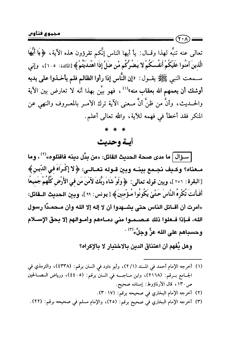 سؤال: ما مدى صحة الحديث القائل: «من بدل دينه فاقتلوه» ، وما معناه؟ وكيف نجمع بينه وبين قوله تعالى: {لَا إِكْرَاهَ فِي الدِّينِ} [البقرة: 256] ، وبين قوله تعالى: {وَلَوْ شَاءَ رَبُّكَ لَآمَنَ مَنْ فِي الْأَرْضِ كُلُّهُمْ جَمِيعًا أَفَأَنْتَ تُكْرِهُ النَّاسَ حَتَّى يَكُونُوا مُؤْمِنِينَ} [يونس: 99] ، وبين الحديث القائل: «أمرت أن أقاتل الناس حتى يشهدوا أن لا إله إلا الله وأن محمدًا رسول الله، فإذا فعلوا ذلك عصموا مني دماءهم وأموالهم إلا بحق الإسلام وحسابهم على الله عز وجل» .