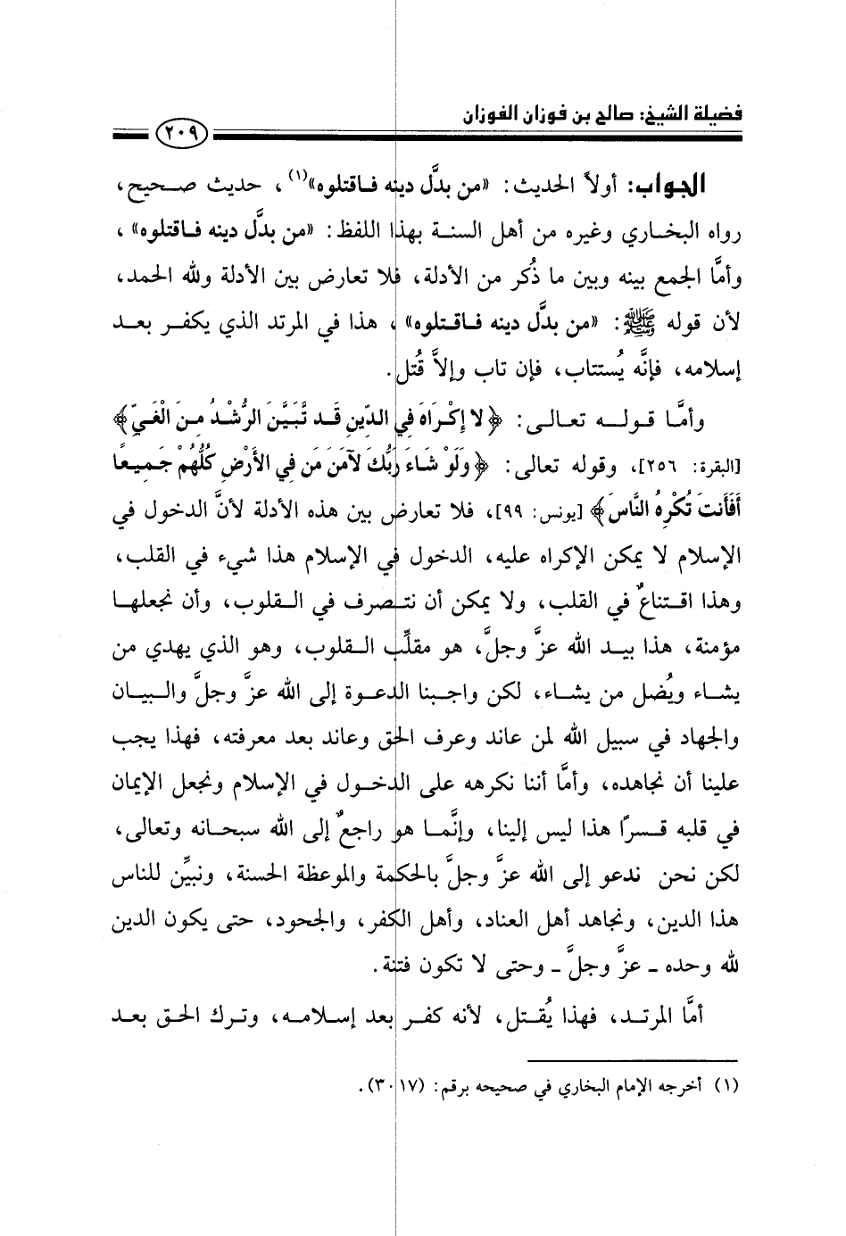 الجواب: أولًا الحديث «من بدل دينه فاقتلوه» حديث صحيح، رواه البخاري وغيره من أهل السنة بهذا اللفظ: «من بدل دينه فاقتلوه» ، وأما الجمع بينه وبين ما ذكر من الأدلة، فلا تعارض بين الأدلة ولله الحمد؛ لأن قوله صلى الله عليه وسلم: «من بدل دينه فاقتلوه» ، هذا في المرتد الذي يكفر بعد إسلامه، فإنه يستتاب، فإن تاب وإلا قتل.