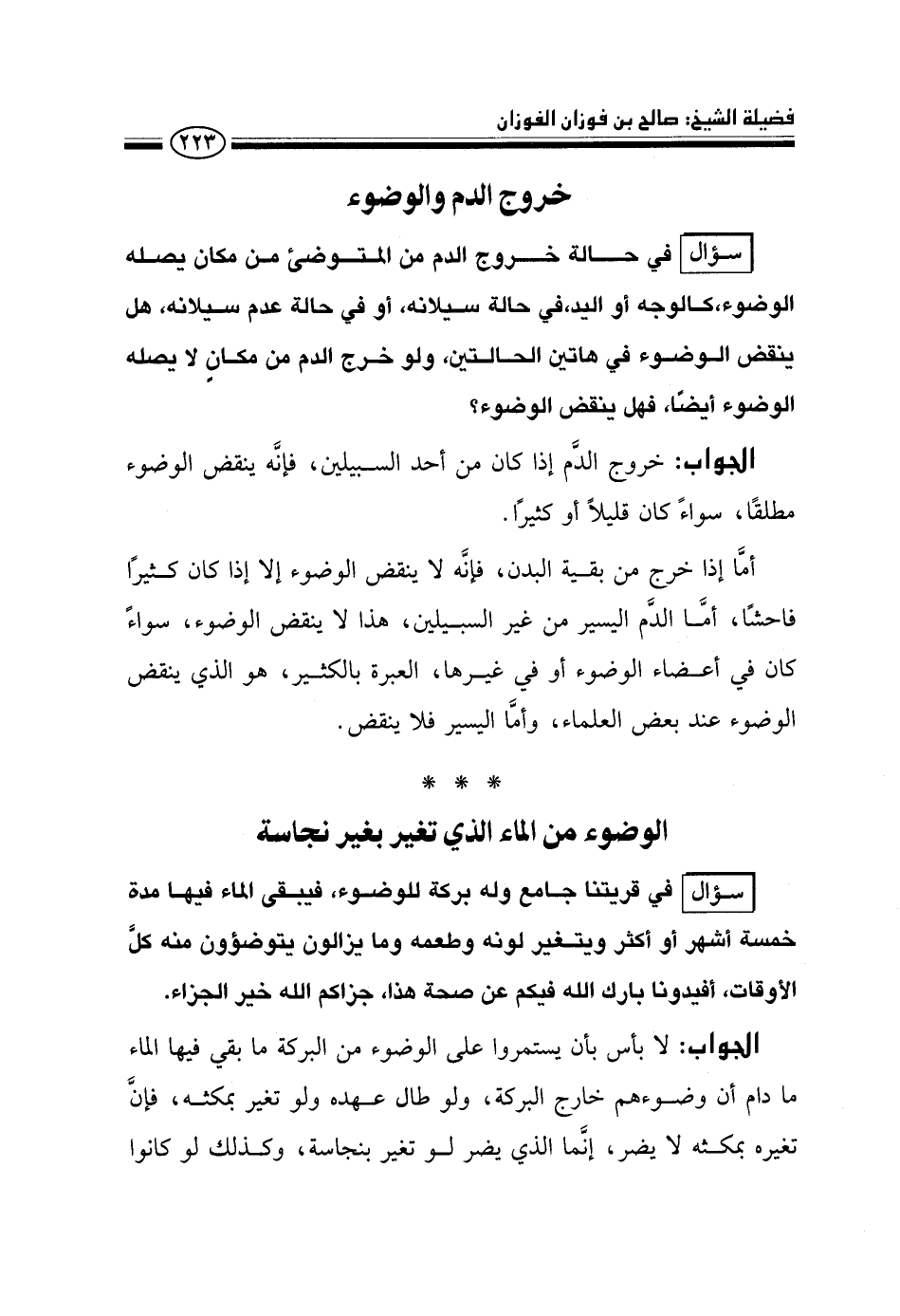 سؤال: في حالة خروج الدم من المتوضئ من مكان يصله الوضوء، كالوجه أو اليد، في حالة سيلانه، أو في حالة عدم سيلانه، هل ينقض الوضوء في هاتين الحالتين، ولو خرج الدم من مكان لا يصله الوضوء أيضًا، فهل ينقض الوضوء؟