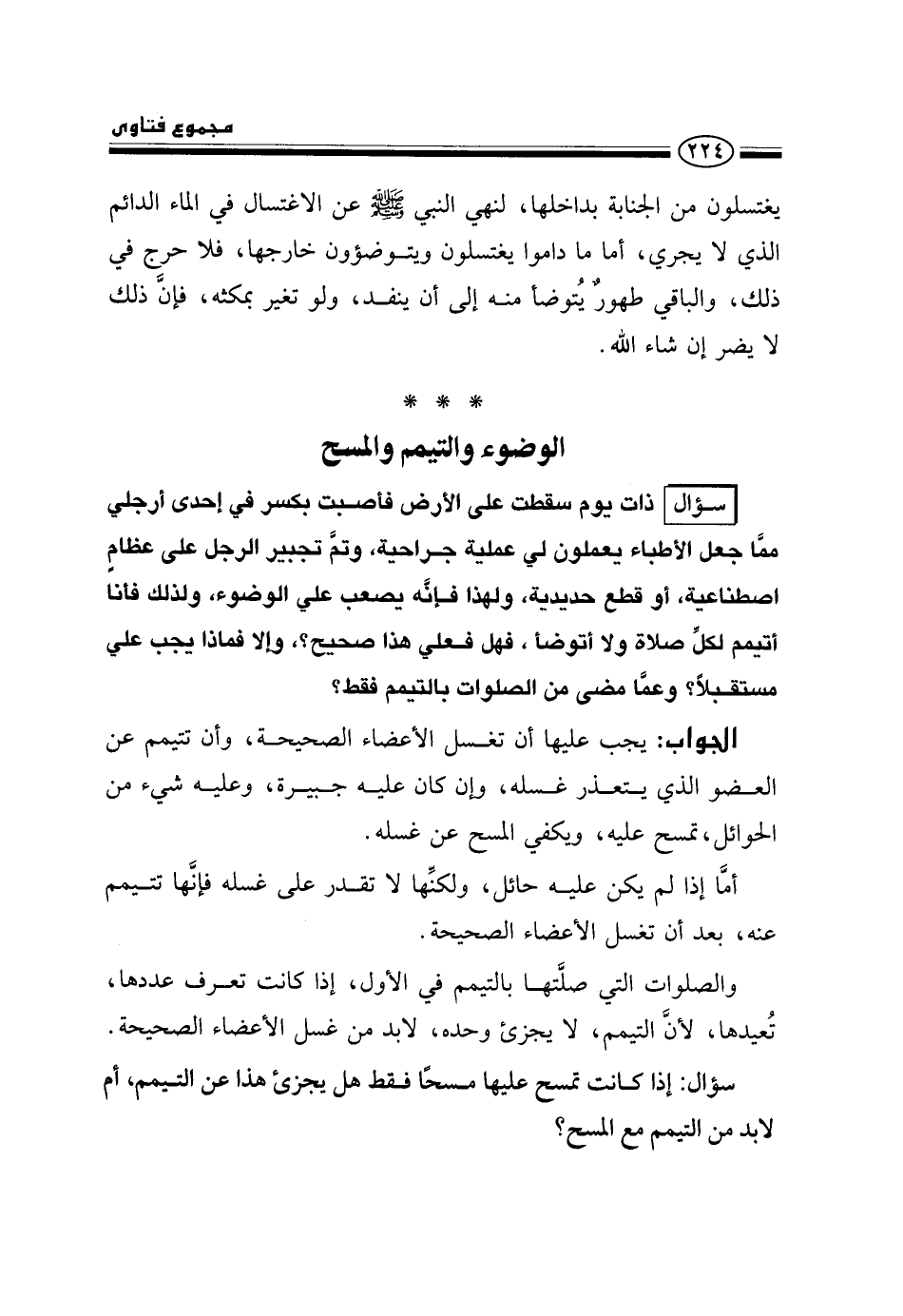 سؤال: ذات يوم سقطت على الأرض فأُصبت بكسر في إحدى أرجلي مما جعل الأطباء يعملون لي عملية جراحية، وتم تجبير الرجل على عظام اصطناعية، أو قطع حديدية، ولهذا فإنه يصعب علي الوضوء، ولذلك فأنا أتيمم لكل صلاة ولا أتوضأ، فهل فعلي هذا صحيح؟ ، وإلا فماذا يجب علي مستقبلًا؟ وعما مضى من الصلوات بالتيمم فقط؟