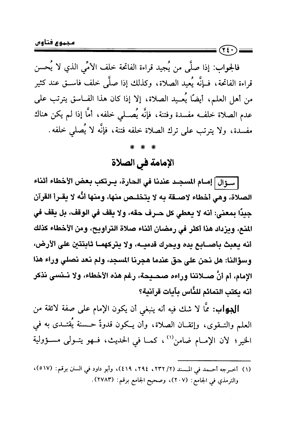 سؤال: إمام المسجد عندنا في الحارة، يرتكب بعض الأخطاء أثناء الصلاة، وهي أخطاء لاصقة به لا يتخلص منها، ومنها أنه لا يقرأ القرآن جيدًا بمعنى: أنه لا يعطي كل حرف حقه، ولا يقف في الوقف، بل يقف في المنع، ويزداد هذا أكثر في رمضان أثناء صلاة التراويح، ومن الأخطاء كذلك أنه يعبث بأصابع يده ويحرك قدميه، ولا يتركهما ثابتتين على الأرض، وسؤالنا: هل نحن على حق عندما هجرنا المسجد، ولم نعد نصلي وراء هذا الإمام، أم أن صلاتنا وراءه صحيحة، رغم هذه الأخطاء، ولا ننسى نذكر أنه يكتب التمائم للناس بآيات قرآنية؟