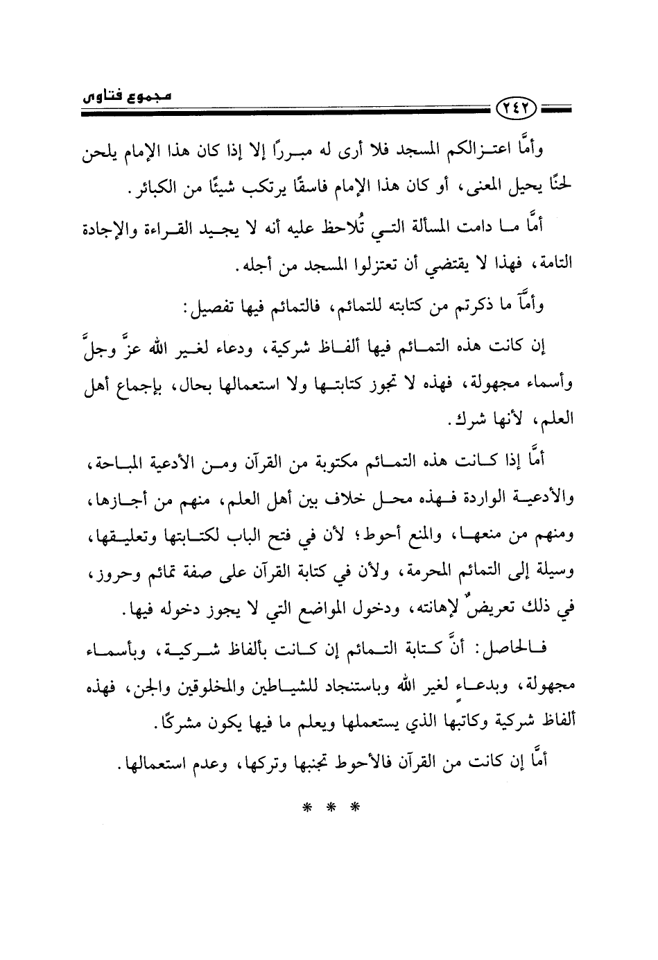 فالحاصل: أن كتابة التمائم إن كانت بألفاظ شركية، وبأسماء مجهولة، وبدعاء لغير الله وباستنجاد للشياطين والمخلوقين والجن، فهذه ألفاظ شركية وكاتبها الذي يستعملها ويعلم ما فيها يكون مشركًا.