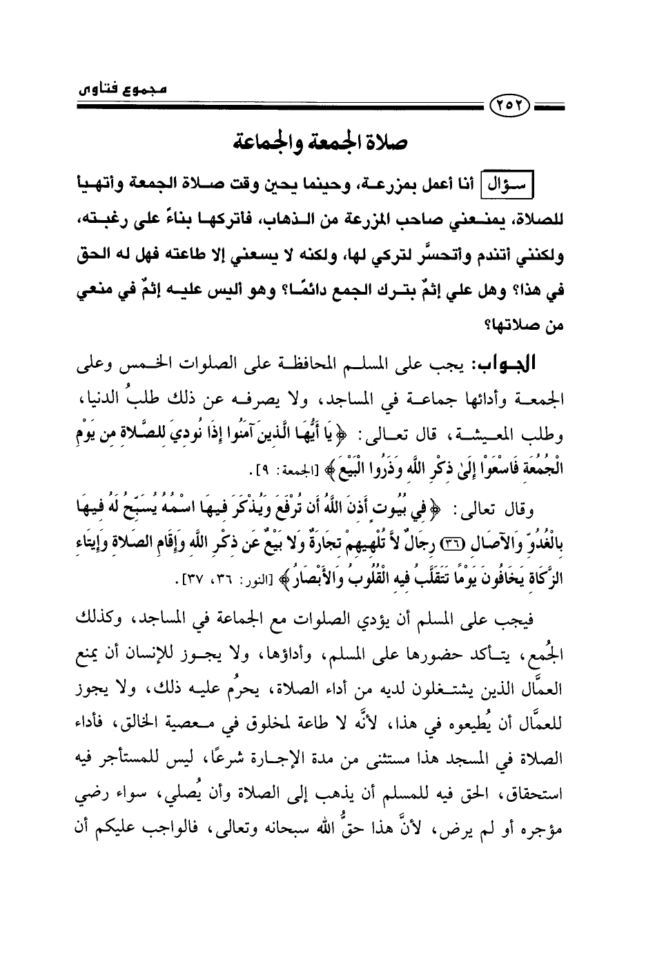 فيجب على المسلم أن يؤدي الصلوات مع الجماعة في المساجد، وكذلك الجُمَع، يتأكد حضورها على المسلم، وأداؤها، ولا يجوز للإنسان أن يمنع العمال الذين يشتغلون لديه من أداء الصلاة، يحرم عليه ذلك، ولا يجوز للعمال أن يطيعوه في هذا؛ لأنه لا طاعة لمخلوق في معصية الخالق، فأداء الصلاة في المسجد هذا مستثنى من مدة الإجازة شرعًا، ليس للمستأجر فيه استحقاق، الحق فيه للمسلم أن يذهب إلى الصلاة وأن يصلي، سواء رضي مؤجره أو لم يرض؛ لأن هذا حق الله سبحانه وتعالى، فالواجب عليكم أن