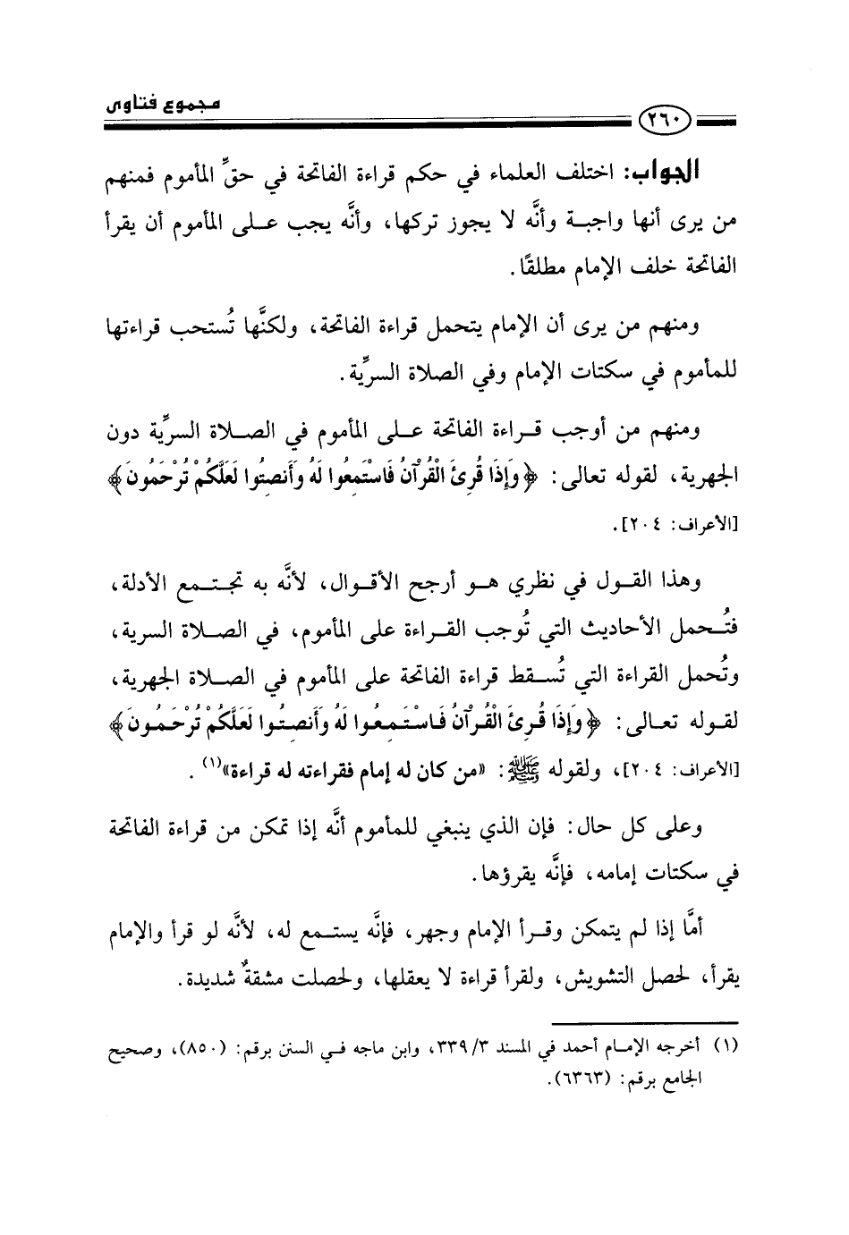 وهذا القول في نظري هو أرجح الأقوال؛ لأنه به تجتمع الأدلة، فتحمل الأحاديث التي توجب القراءة على المأموم، في الصلاة السرية، وتحمل القراءة التي تسقط قراءة الفاتحة على المأموم في الصلاة الجهرية، لقوله تعالى: {وَإِذَا قُرِئَ الْقُرْآنُ فَاسْتَمِعُوا لَهُ وَأَنْصِتُوا لَعَلَّكُمْ تُرْحَمُونَ} [الأعراف: 204] ، ولقوله صلى الله عليه وسلم: «من كان له إمام فقراءته له قراءة» .