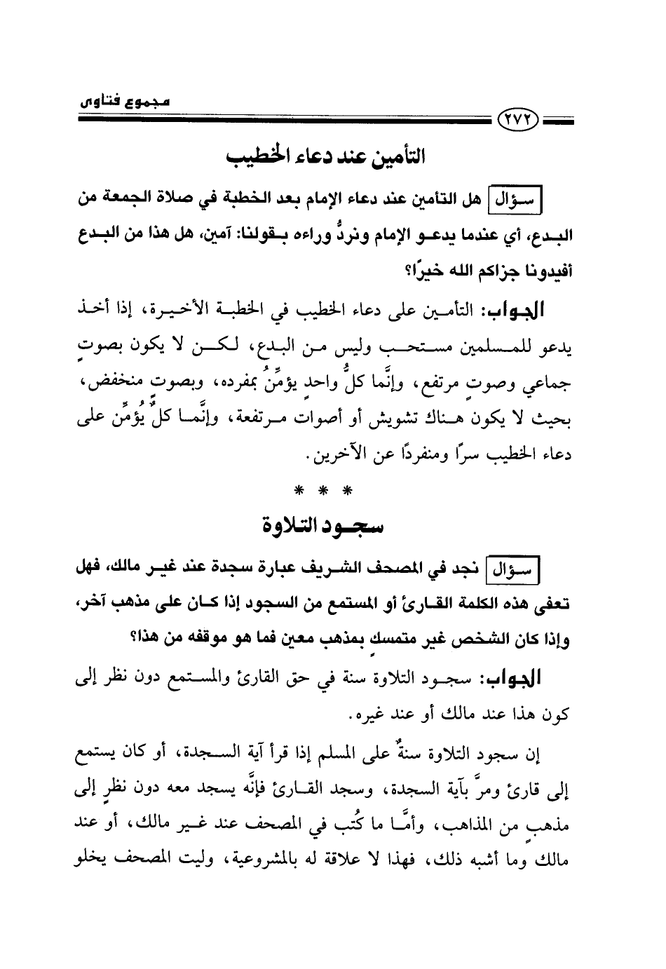 سؤال: نجد في المصحف الشريف عبارة "سجدة عند غير مالك "، فهل تعفي هذه الكلمة القارئ أو المستمع من السجود إذا كان على مذهب آخر، وإذا كان الشخص غير متمسك بمذهب معين فما هو موقفه من هذا؟