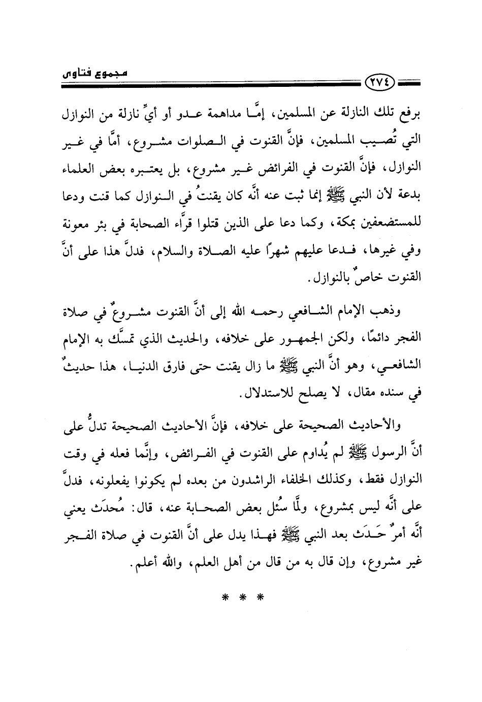 وذهب الإمام الشافعي رحمه الله إلى أن القنوت مشروع في صلاة الفجر دائمًا، ولكن الجمهور على خلافه، والحديث الذي تمسك به الإمام الشافعي، وهو أن النبي صلى الله عليه وسلم ما زال يقنت حتى فارق الدنيا، هذا حديث في سنده مقال، لا يصلح للاستدلال.