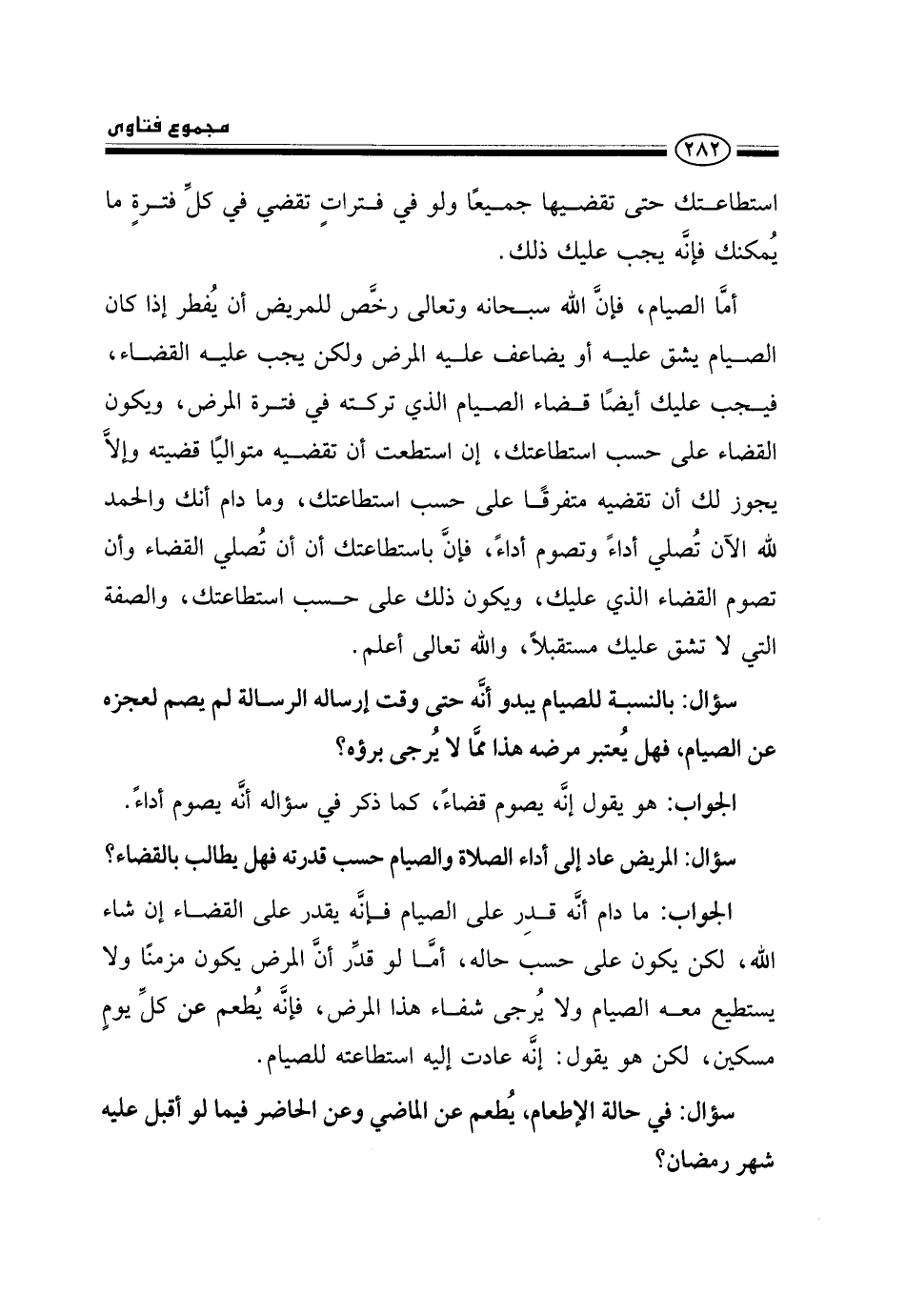 سؤال: بالنسبة للصيام يبدو أنه حتى وقت إرساله الرسالة لم يصم لعجزه عن الصيام، فهل يعتبر مرضه هذا مما لا يرجى برؤه؟
