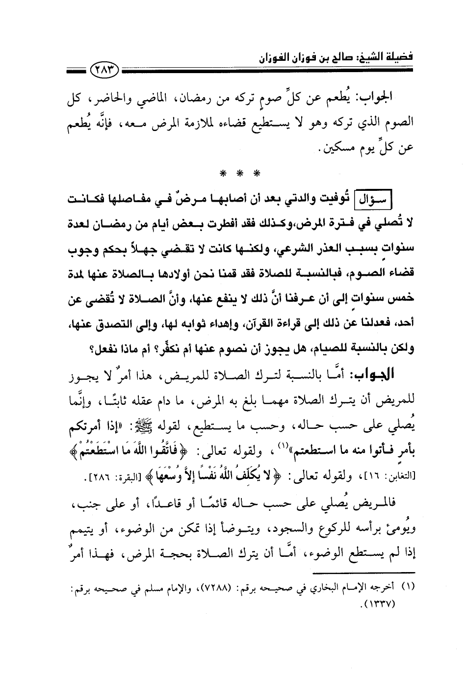 الجواب: أما بالنسبة لترك الصلاة للمريض، هذا أمر لا يجوز للمريض أن يترك الصلاة مهما بلغ به المرض، ما دام عقله ثابتًا، وإنما يصلي على حسب حاله، وحسب ما يستطيع؛ لقوله صلى الله عليه وسلم: «إذا أمرتكم بأمر فأتوا منه استطعتم» ؛ ولقوله تعالى: {فَاتَّقُوا اللَّهَ مَا اسْتَطَعْتُمْ} [التغابن: 16] ؛ ولقوله تعالى: {لَا يُكَلِّفُ اللَّهُ نَفْسًا إِلَّا وُسْعَهَا} [البقرة: 286] .