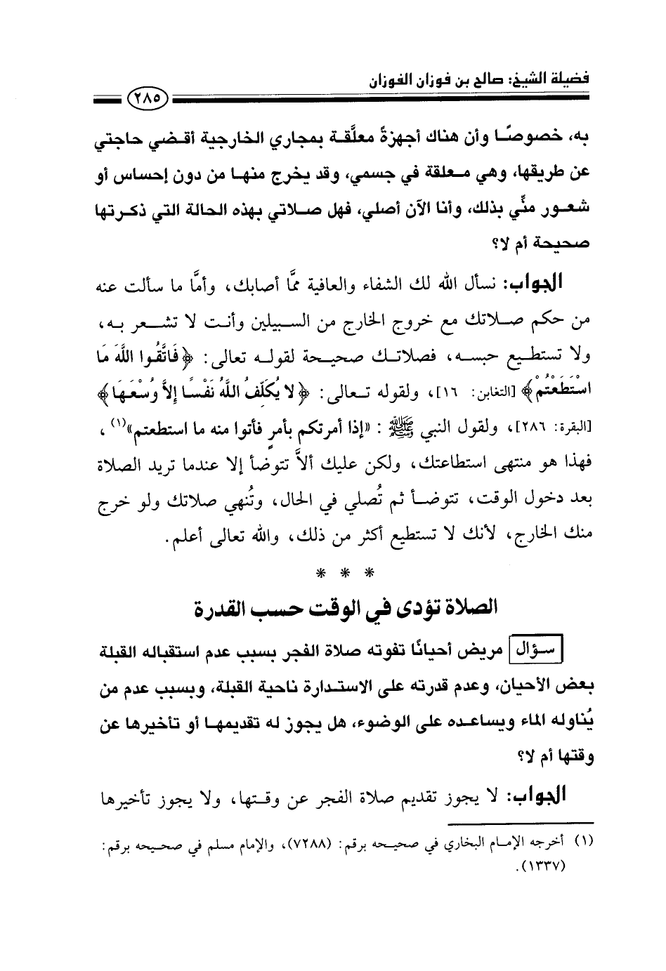 الجواب: نسأل الله لك الشفاء والعافية مما أصابك، وأما ما سألت عنه من حكم صلاتك مع خروج الخارج من السبيلين وأنت لا تشعر به، ولا تستطيع حبسه، فصلاتك صحيحة؛ لقوله تعالى: {فَاتَّقُوا اللَّهَ مَا اسْتَطَعْتُمْ} [التغابن: 16] ؛ ولقوله تعالى: {لَا يُكَلِّفُ اللَّهُ نَفْسًا إِلَّا وُسْعَهَا} [البقرة: 286] ؛ ولقول صلى الله عليه وسلم: «إذا أمرتكم بأمر فأتوا منه استطعتم» ، فهذا هو منتهى استطاعتك، ولكن عليك ألا تتوضأ إلا عندما تريد الصلاة بعد دخول الوقت، تتوضأ ثم تصلي في الحال، وتنهي صلاتك ولو خرج منك الخارج؛ لأنك لا تستطيع أكثر من ذلك، والله تعالى أعلم.