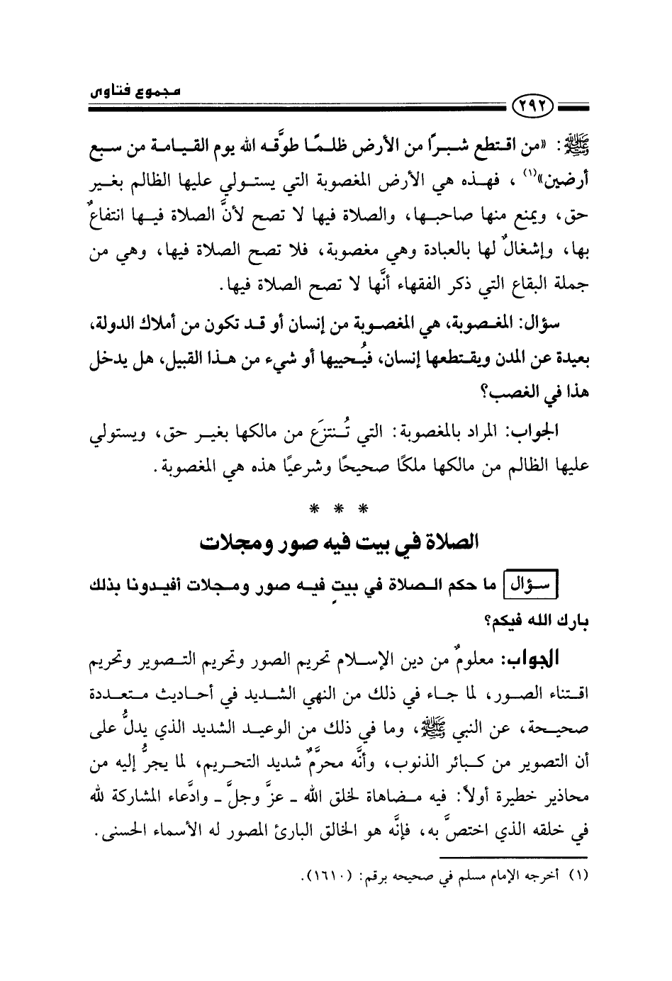 صلى الله عليه وسلم: «من اقتطع شبرًا من الأرض ظلمًا طوقه الله يوم القيامة من سبع أرضين» ، فهذه هي الأرض المغصوبة التي يستولي عليها الظالم بغير حق، ويمنع منها صاحبها، والصلاة فيها لا تصح؛ لأن الصلاة فيها انتفاع بها، وإشغال لها بالعبادة وهي مغصوبة، فلا تصح الصلاة فيها، وهي من جملة البقاع التي ذكر الفقهاء أنها لا تصح الصلاة فيها.