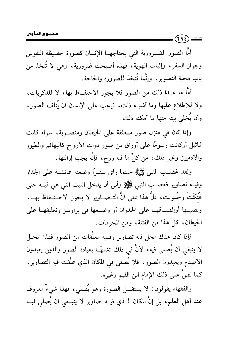 أما الصور الضرورية التي يحتاجها الإنسان كصورة حفيظة النفوس وجواز السفر، وإثبات الهوية، فهذه أصبحت ضرورية، وهي لا تتخذ من باب محبة التصوير، وإنما تتخذ للضرورة والحاجة.