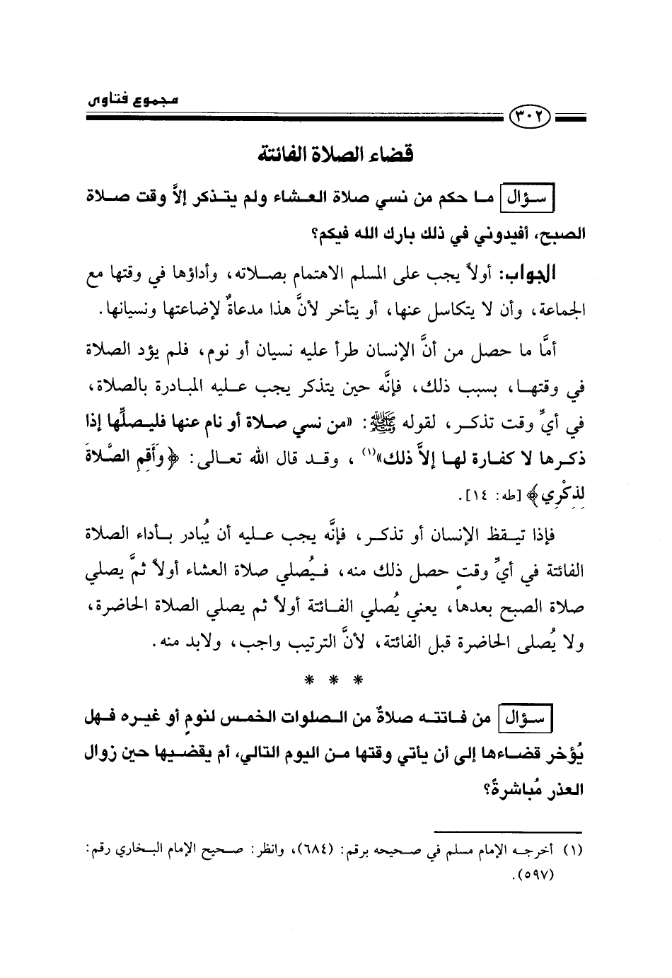 سؤال: من فاتته صلاة من الصلوات الخمس لنوم أو غيره فهل يؤخر قضاءها إلى أن يأتي وقتها من اليوم التالي، أم يقضيها حين زوال العذر مباشرة؟