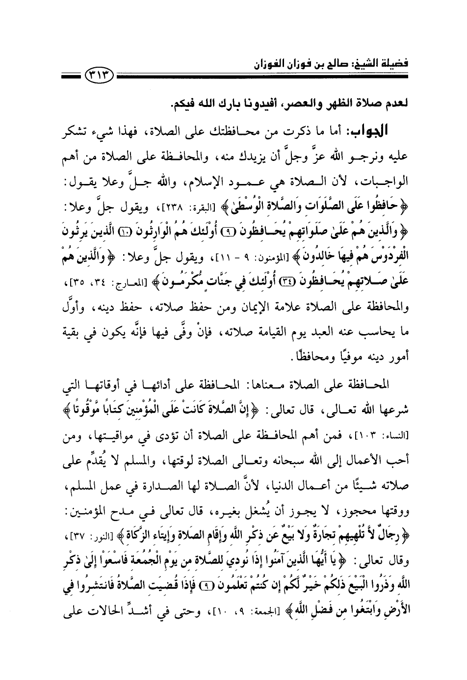 الجواب: أما ما ذكرت من محافظتك على الصلاة، فهذا شيء تشكر عليه، ونرجو الله عز وجل أن يزيدك منه، والمحافظة على الصلاة من أهم الواجبات؛ لأن الصلاة هي عمود الإسلام، والله جل وعلا يقول: {حَافِظُوا عَلَى الصَّلَوَاتِ وَالصَّلَاةِ الْوُسْطَى} [البقرة: 238] ، ويقول جل وعلا: {وَالَّذِينَ هُمْ عَلَى صَلَوَاتِهِمْ يُحَافِظُونَ أُولَئِكَ هُمُ الْوَارِثُونَ الَّذِينَ يَرِثُونَ الْفِرْدَوْسَ هُمْ فِيهَا خَالِدُونَ} [المؤمنون: 9-11] ، ويقول جل وعلا: {وَالَّذِينَ هُمْ عَلَى صَلَاتِهِمْ يُحَافِظُونَ أُولَئِكَ فِي جَنَّاتٍ مُكْرَمُونَ} [المعارج: 34، 35] ، والمحافظة على الصلاة علامة الإيمان، ومن حفظ صلاته، حفظ دينه، وأول ما يحاسب عنه العبد يوم القيامة صلاته، فإن وفى فيها فإنه يكون في بقية أمور دينه موفيًا ومحافظًا.