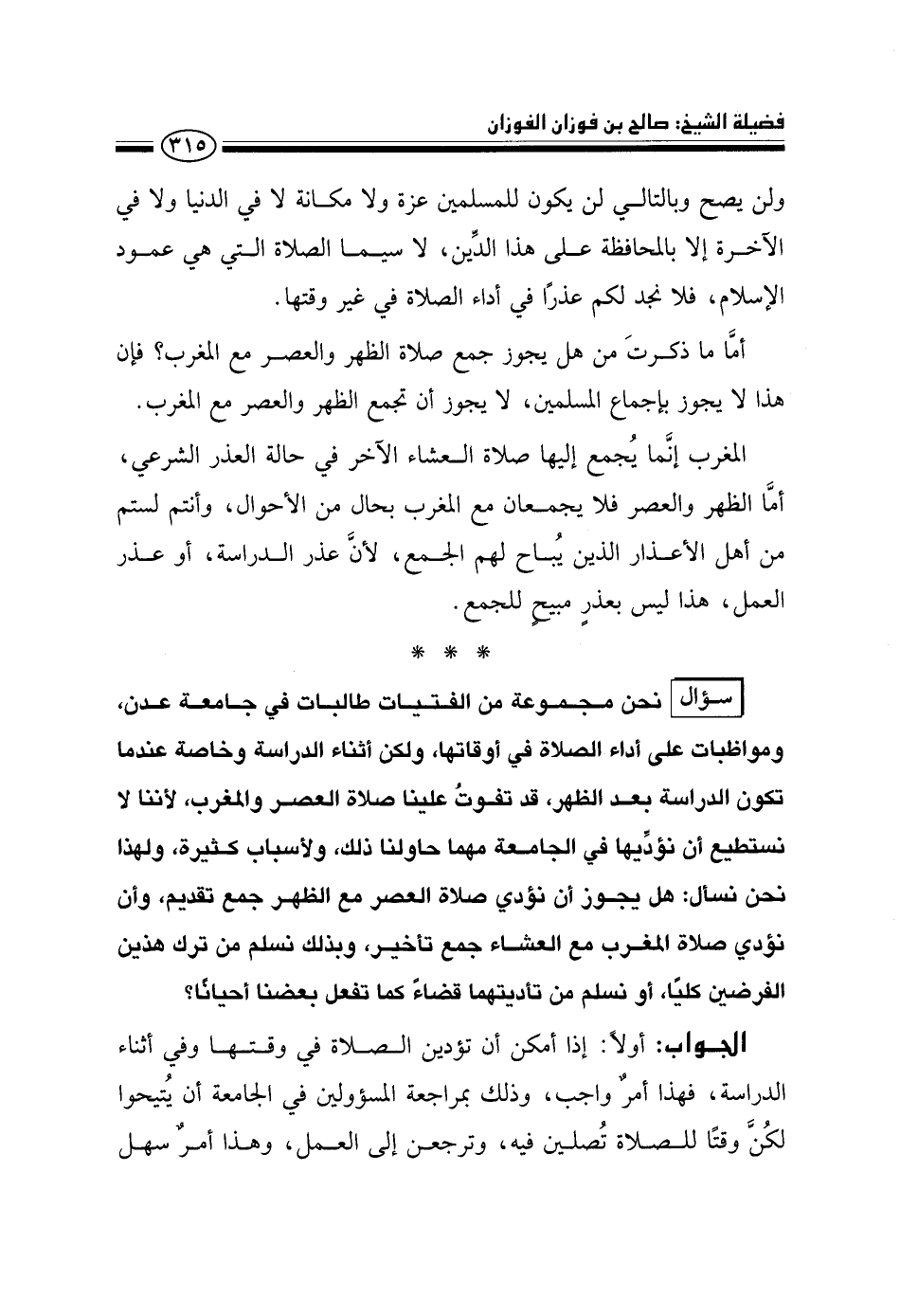 سؤال: نحن مجموعة من الفتيات طالبات في جامعة عدن، ومواظبات على أداء الصلاة في أوقاتها، ولكن أثناء الدراسة وخاصة عندما تكون الدراسة بعد الظهر، قد تفوت علينا صلاة العصر والمغرب؛ لأننا لا نستطيع أن نؤديها في الجامعة مهما حاولنا ذلك، ولأسباب كثيرة، ولهذا نحن نسأل: هل يجوز أن نؤدي صلاة العصر مع الظهر جمع تقديم، وأن نؤدي صلاة المغرب مع العشاء جمع تأخير، وبذلك نسلم من ترك هذين الفرضين كليًا، أو نسلم من تأديتها قضاءً كما تفعل بعضنا أحيانًا؟