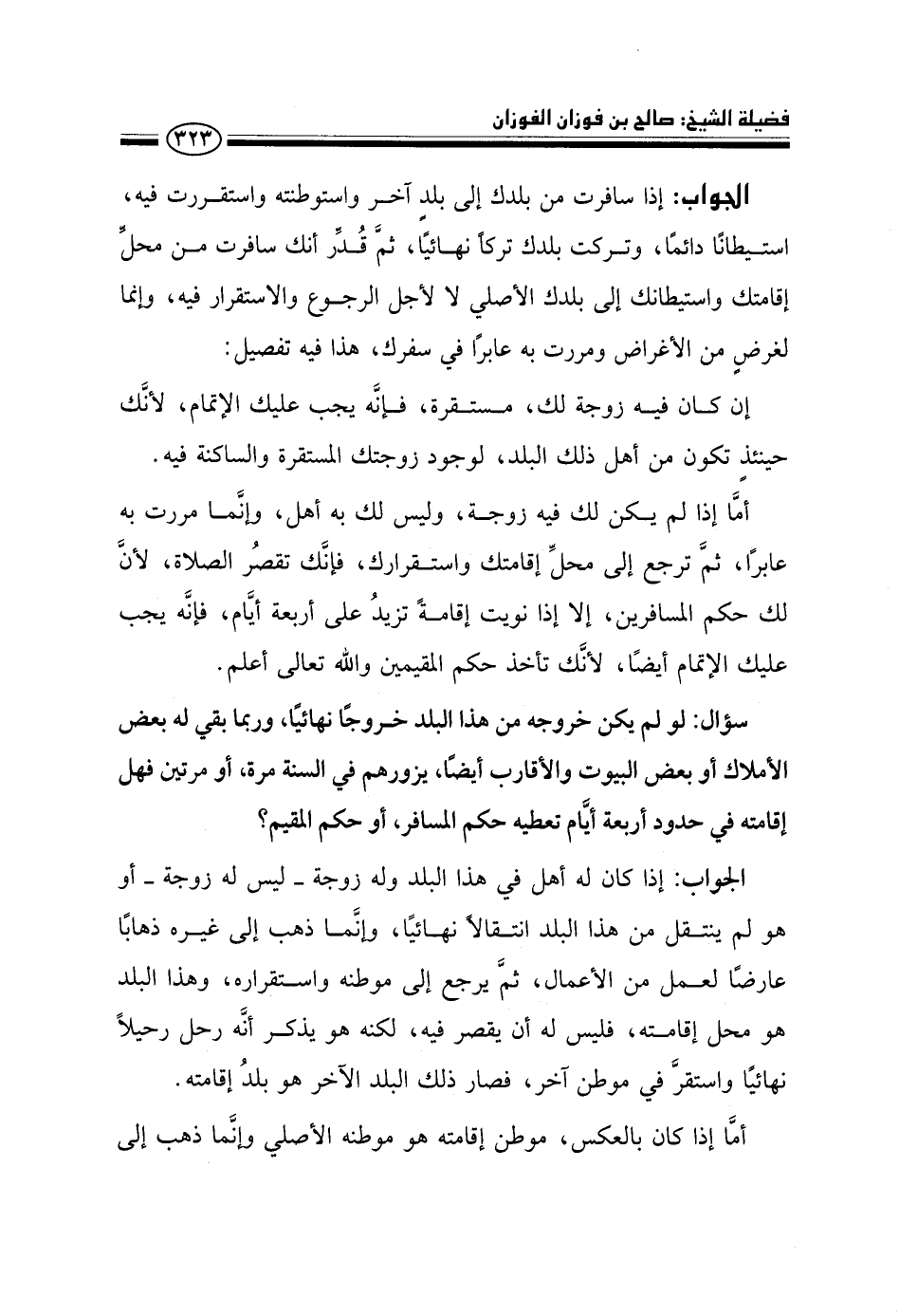 سؤال: لو لم يكن خروجه من هذا البلد خروجًا نهائيًا، وربما بقي له بعض الأملاك أو بعض البيوت والأقارب أيضًا، يزورهم في السنة مرة، أو مرتين فهل إقامته في حدود أربعة أيام تعطيه حكم المسافر، أو حكم المقيم؟