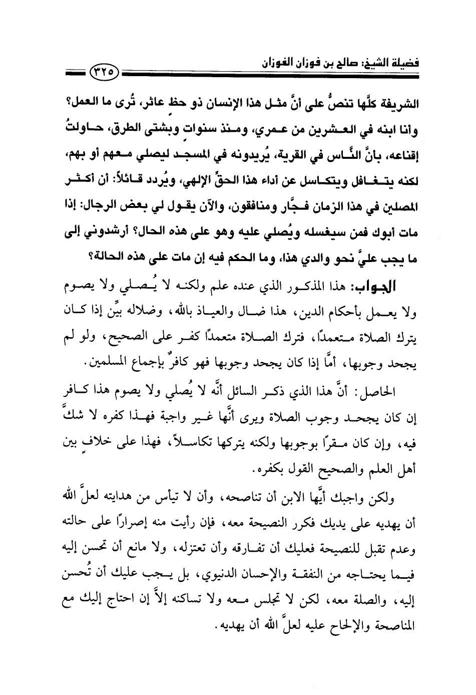 وأنا ابنه في العشرين من عمري، ومنذ سنوات وبشتى الطرق، حاولت إقناعه، بأن الناس في القرية، يريدونه في المسجد ليصلي معهم أو بهم، لكنه يتغافل ويتكاسل عن أداء هذا الحق الإلهي، ويردد قائلًا: أن أكثر المصلين في هذا الزمان فجّار ومنافقون، والآن يقول لي بعض الرجال: إذا مات أبوك فمن سيغسله ويصلي عليه وهو على هذه الحال؟ أرشدوني إلى ما يجب علي نحو والدي هذا، وما الحكم فيه إن مات على هذه الحالة؟