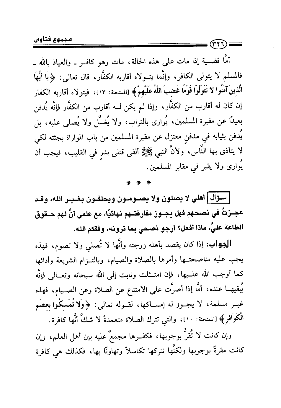 الجواب: إذا كان يقصد بأهله زوجته، وأنها لا تصلي ولا تصوم، فهذه يجب عليه مناصحتها وأمرها بالصلاة والصيام، وبالتزام الشريعة وأدائها كما أوجب الله عليها، فإن امتثلت وتابت إلى الله سبحانه وتعالى فإنه يُبقيها عنده، أما إذا أصرت على الامتناع عن الصلاة وعن الصيام، فهذه غير مسلمة، لا يجوز له إمساكها؛ لقوله تعالى: {وَلَا تُمْسِكُوا بِعِصَمِ الْكَوَافِرِ} [الممتحنة: 10] ، والتي تترك الصلاة متعمدة لا شك أنها كافرة.