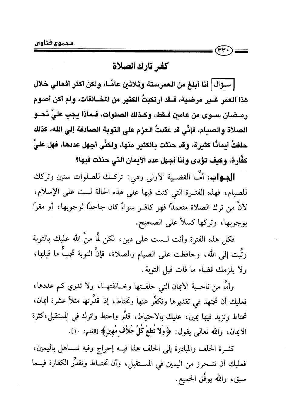 سؤال: أنا أبلغ من العمر ستة وثلاثين عامًا، ولكن أكثر أفعالي خلال هذا العمر غير مرضية، فقد ارتكبت الكثير من المخالفات، ولم أكن أصوم رمضان سوى من عامين فقط، وكذلك الصلوات، فماذا يجب عليّ نحو الصلاة والصيام، فإني قد عقدت العزم على التوبة الصادقة إلى الله، كذلك حلفت أيمانًا كثيرة، وقد حنثت بالكثير منها، ولكني أجهل عددها، فهل علي كفارة، وكيف تؤدى وأنا أجهل عدد الأيمان التي حنثت فيها؟