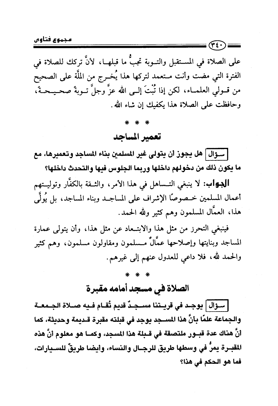 سؤال: يوجد في قريتنا مسجد قديم تقام فيه صلاة الجمعة والجماعة علمًا بأن هذا المسجد يوجد في قبلته مقبرة قديمة وحديثة، كما أن هناك عدة قبور ملتصقة في قبلة هذا المسجد، وكما هو معلوم أن هذه المقبرة يمر في وسطها طريق للرجال والنساء، وأيضًا طريق للسيارات، فما هو الحكم في هذا؟