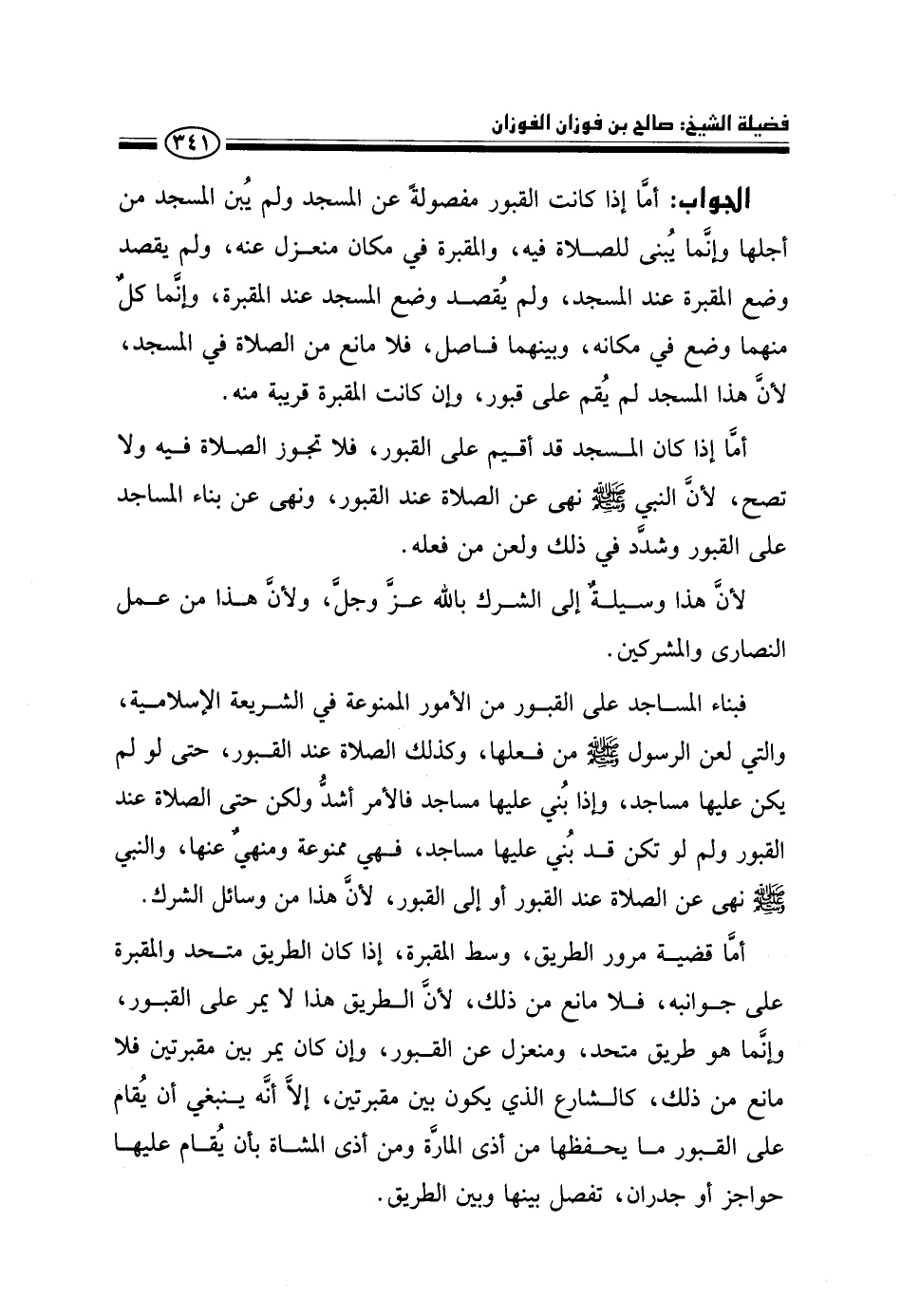 الجواب: أما إذا كانت القبور مفصولة عن المسجد ولم يبن المسجد من أجلها، وإنما يبنى للصلاة فيه، والمقبرة في مكان منعزل عنه، ولم يقصد وضع المقبرة عند المسجد، ولم يقصد وضع المسجد عند المقبرة، وإنما كل منهما وضع في مكانه، وبينهما فاصل، فلا مانع من الصلاة في المسجد؛ لأن هذا المسجد لم يُقم على قبور، وإن كانت المقبرة قريبة منه.